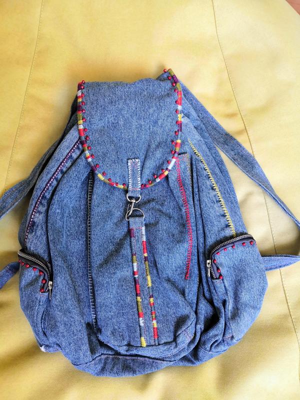 Супер крутой, яркий, единственный в своем роде джинсовый рюкзак с разноцветным подкладом. Обшит вручную цветными нитками и бусинами, рванка по верхнему краю.Верх затягивается на шнурок и закрывается карабинчиком. Внутри есть карманы, снаружи один большой и два маленьких по бокам. Длина лямок не регулируется, но при надобности можно расшить и сделать под себя. Очень вместительный. Подчеркнёт ваш стиль и яркую индивидуальность! Если есть вопросы - пишите, обязательно отвечу.