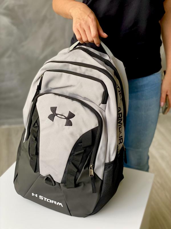 Новая модель рюкзаков UNDER ARMOUR STORM! Удобный и вместительный! Отличного качества! Характеристика: - Логотип UNDER ARMOUR - вышивка в верхней центральной части рюкзака; - Плотная лицевая часть; - Твердая спинка с дышащими вставками; - Дно и низ спереди облиты износостойким каучуком; - Два боковых кармана для воды с сеточки; - Внешних два кармана - органайзера на замку; - Внешних два больших отдела на замку; - Вместительное основное отделение с двумя раздельными отделами; - Удобные мягкие, широкие, крепкие шлейки, регулируемые по длине; - Ручка сверху - широкая, мягкая, крепкая. Размер: 46х32х20 Цвет - черный, серый с черным; Ткань - оксфорд, с водоотталкивающим ефектом. Дно - облито износостойким каучуком Подкладка - плотный полиэстер.