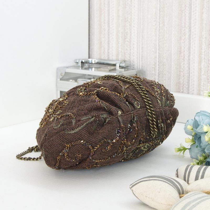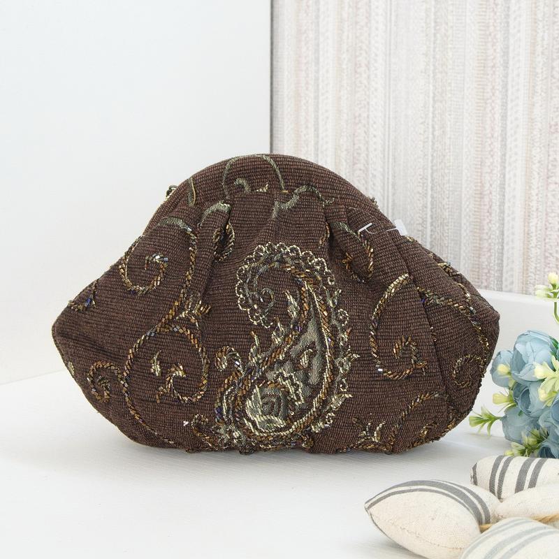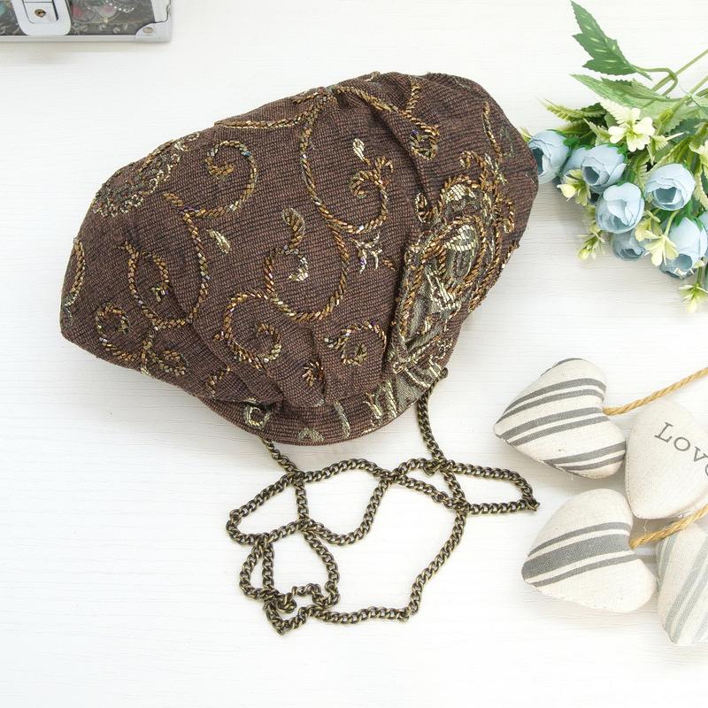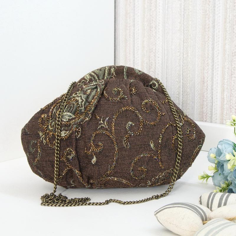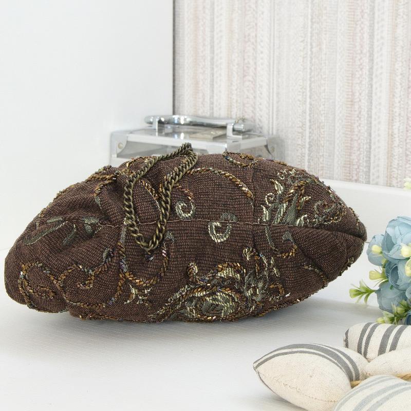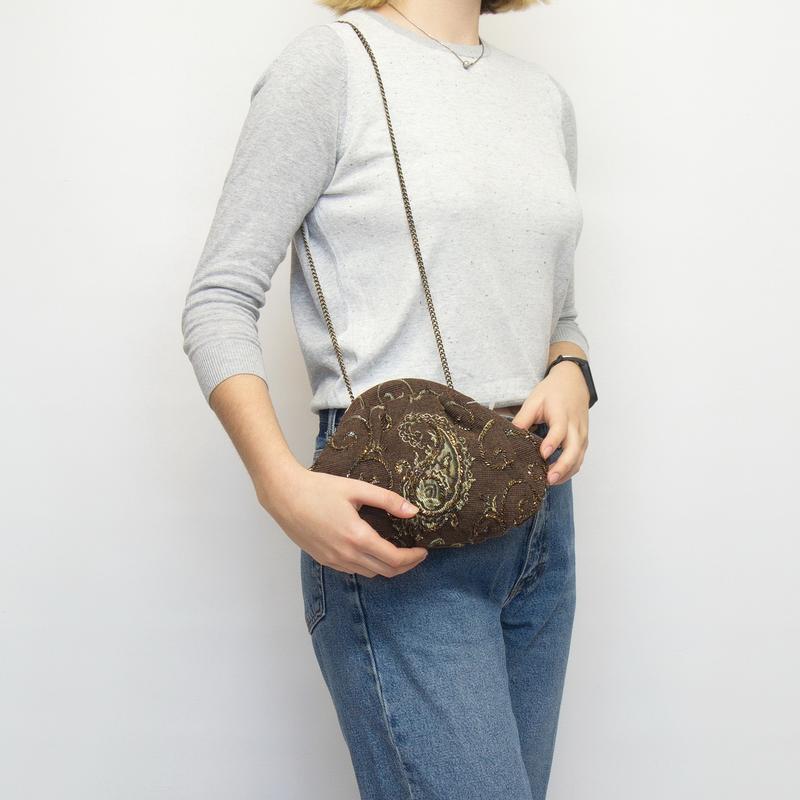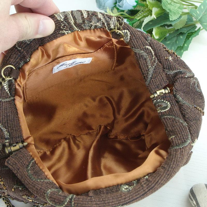 Вы только представьте все богатство материалов и текстур! По плотному фактурному гобелену с рельефным золотистым орнаментом идет изящная объемная вышивка сверкающим, переливающимся в лучах света, стеклярусом. Это великолепие закрывается на медный массивный фермуар на пружинке. Можно носить на цепочке или в руке, в этом случае цепочка прячется вовнутрь. Мало того, что сумочка великолепна, она еще и очень емкая. Все наши дамские мелочи располагаются вполне комфортно.