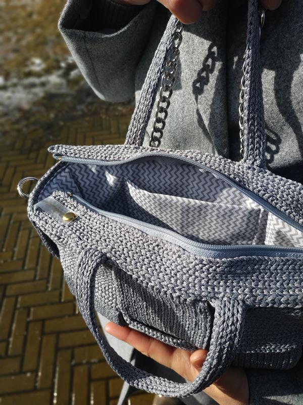 Сумка из полипропиленового шнура на молнии с малыми ручками и большой цепью с подкладкой и кармашком внутри