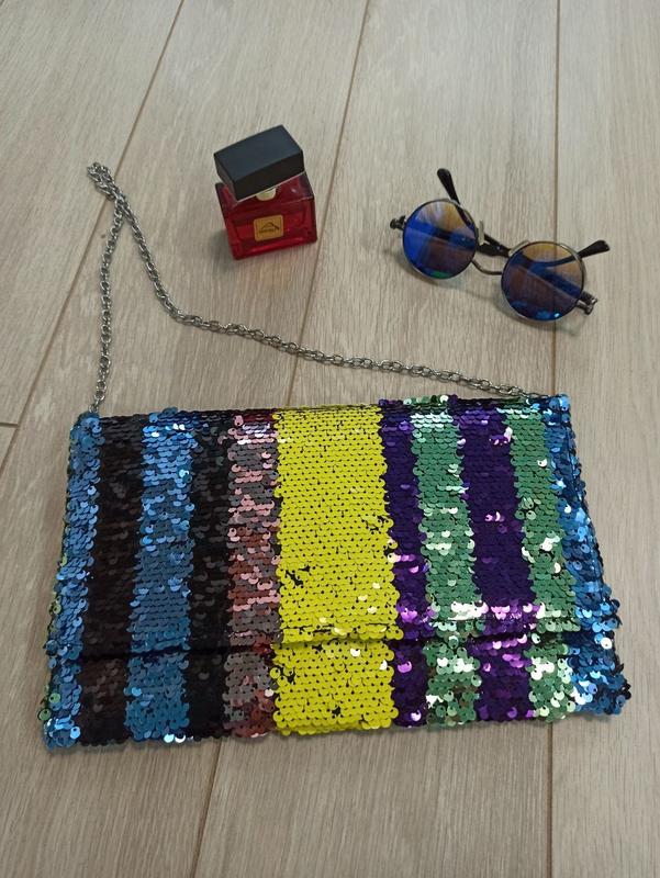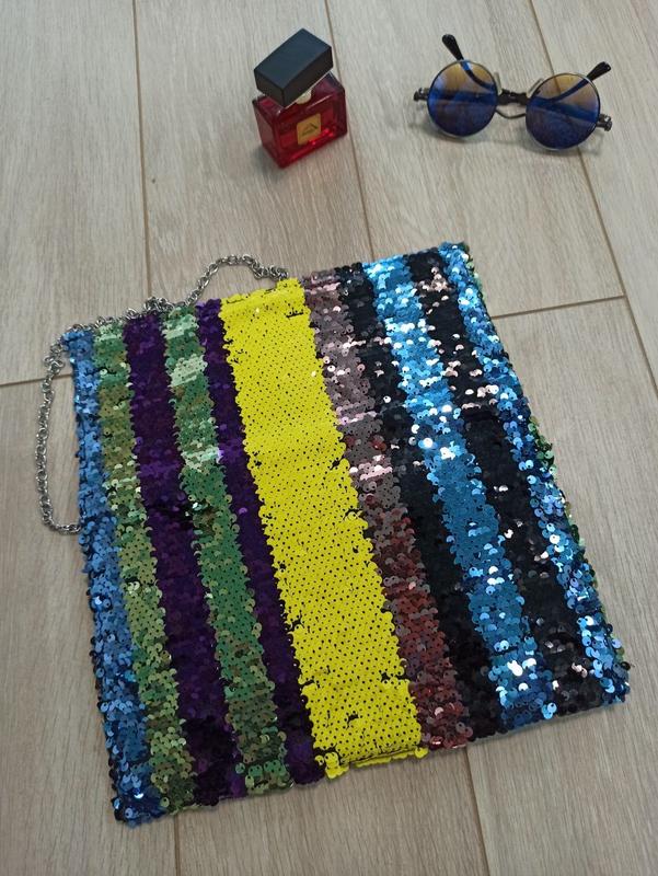 Сумочка-клатч с пайетками на цепочке. Primark. Размер: 28 см на 17 см. Цепочка серебряная, длина 68 см.