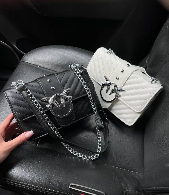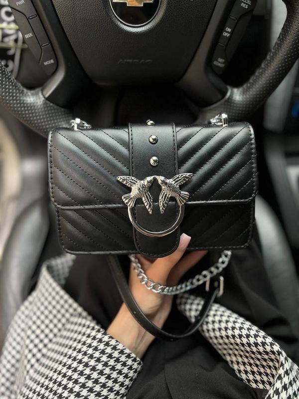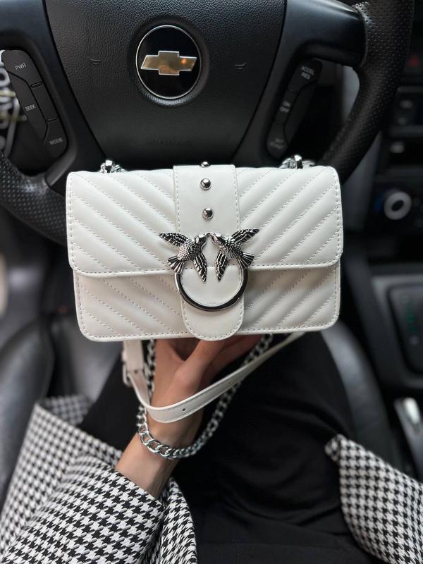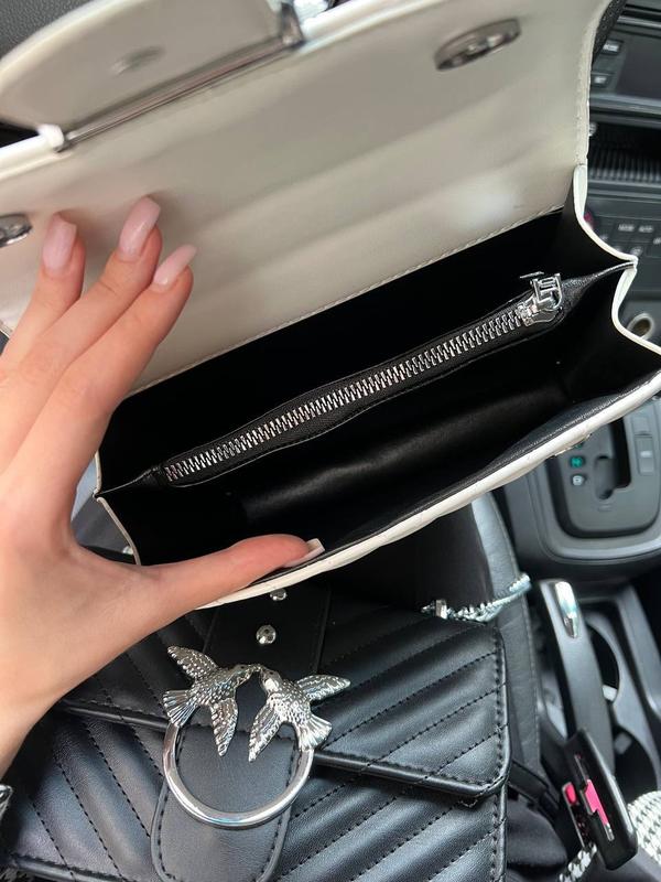 Два филиала с перегородкой на замке. Длинный ремешок-цепочка с ручкой. Можно носить и как клатч