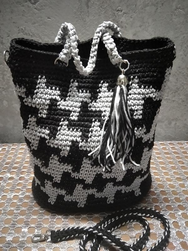 Сумочка ручной работы.Имеет ручки и ремень который снимается.Размер средний. Изготовлена из шнура макраме в стиле жаккарда.