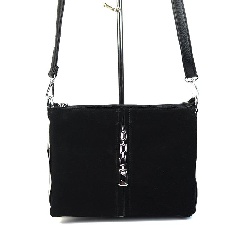 Маленькая женская замшевая прямоугольная сумка кросс-боди через плечо Модель с длинным ремешком. Искусственная кожа + натуральная замша, цвет черный, серый. Серебристая блестящая фурнитура. Три отделения на молнии. Размер: 25x17x9 см. Ремешок длинный 120 см максимальная длина. На лицевой части карман на молнии, на задней стенке карман на молнии, внутри два открытых маленьких кармана и один на молнии. Стильный красочный модный аксессуар через плечо на молнии. ДН 9014 замш/bla