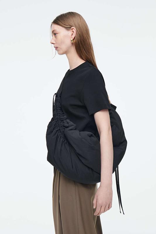 Сохраняя свою искусно рюшеную форму, сумка Canopy масштабируется до преувеличенных пропорций. Изготовлен из мягкого нейлона, она имеет регулируемый ремешок через плечо и завязки на шнурке с обеих сторон, чтобы создать ее фирменный собранный силуэт. Все, что вам нужно, поместится внутри отделения на молнии.