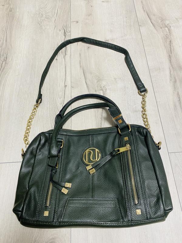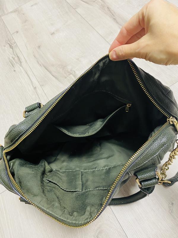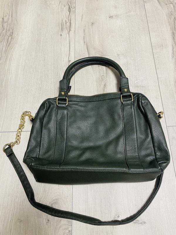 Размеры: Ширина - 36 см.Висота - 24.5 см.Глибина - 8 см.Внутри один карман на замочке, одно большое отделение и 2 карманных для телефона.Материал : кожзаменительЦвет такой темный зеленыйСумка в идеальном состоянии, без царапин и потертостей