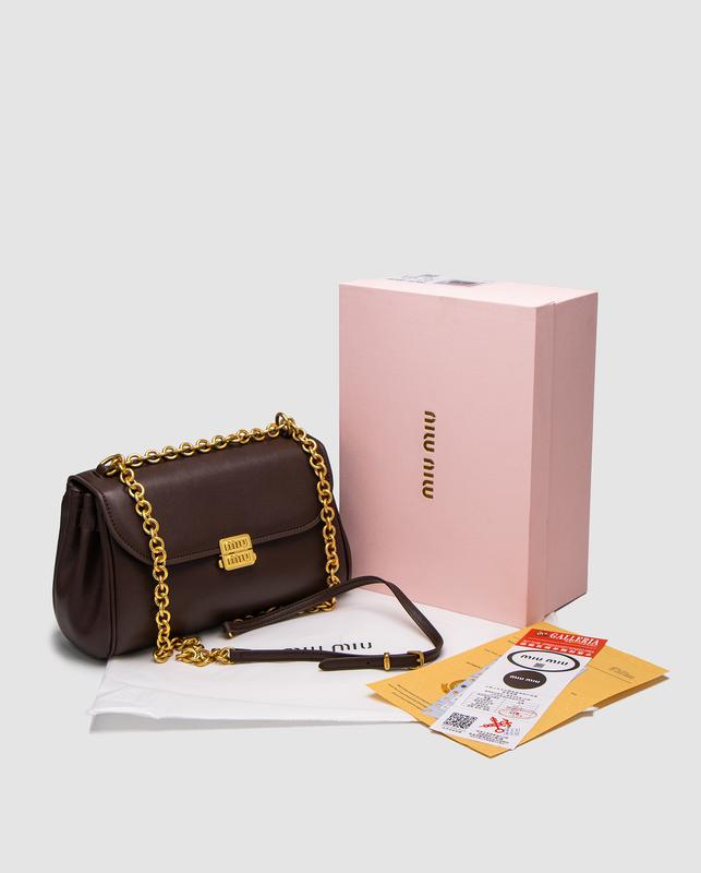 Жіноча коричнева сумка з натуральної шкіри Miu Miu Nappa Shoulder Bag Ціна: 4200 грн Розмір: 24 х 16 х 7 см Матеріал: Натуральна шкіра Сумка виконана з гладкої шкіри. Всередині одне велике відділення, також є невеличка кишеня. Підкладка з щільного та якісного текстилю. Зачиняється відділення на фірмовому механізмі. Фурнітура металева, брендована. Металевий ланцюжок фіксованої довжини, з шкіряною ручкою. Комплектується у брендовій коробці та пильовику, також є буклети.