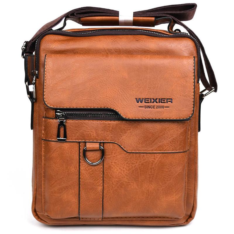Мужская кожаная сумка из искуственной кожи Weixier Мужская кожаная сумка из искуственной кожи Weixier Ищете стильную и практичную сумку, которая будет идеально дополнять ваш повседневный образ? Эта мужская сумка через плечо из экокожи сочетает в себе элегантный дизайн, функциональность и удобство. Она станет вашим надежным спутником как в офисе, так и в путешествиях. Преимущества Универсальность: Подходит для офиса, учебы, прогулок и поездок. Можно носить на плече, через плечо или в руках благодаря встроенной ручке. Организованность: Основной отдел с двумя внутренними карманами, задний карман на молнии, передний карман на молнии и открытый карман под клапаном обеспечат быстрый доступ к вашим вещам. Качество материалов: Изготовлена из прочной экокожи с водоотталкивающими и износостойкими свойствами. Металлическая фурнитура добавляет долговечности и стиля. Регулируемый ремень: Плечевой ремень-стропа регулируется по длине, чтобы обеспечить максимальный комфорт. Компактность и вместительность: Идеально подходит для хранения планшета, смартфона, фотоаппарата, документов, портмоне и других мелочей, необходимых в повседневной жизни. Легкость: Вес сумки составляет всего 600 г, что делает ее удобной для ношения весь день. Эта сумка станет отличным подарком для современного мужчины. Будь то деловая встреча, прогулка или путешествие, она обеспечит стильный и практичный способ хранения ваших вещей. Удобство, стиль и надежность – все это объединено в одном аксессуаре. Характеристики Тип: Сумка на плечо Материал: Экокожа Материал подкладки: Полиэстер Материал фурнитуры: Металл Размеры: Высота – 27.5 см, ширина – 22.5 см, глубина – 9 см Цвет: Светло-коричневый Целевая аудитория: Мужчины Вес: 600 г Страна изготовления: Китай.