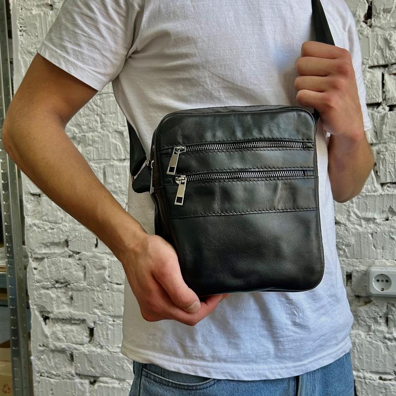 Мужская сумка через плечо кожаная глянцевая черная детройт глянец 21х19х5 см, сумка мессен...