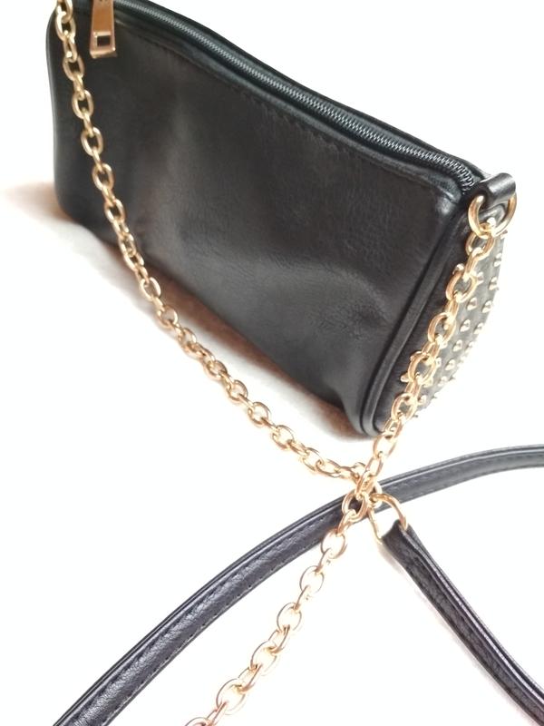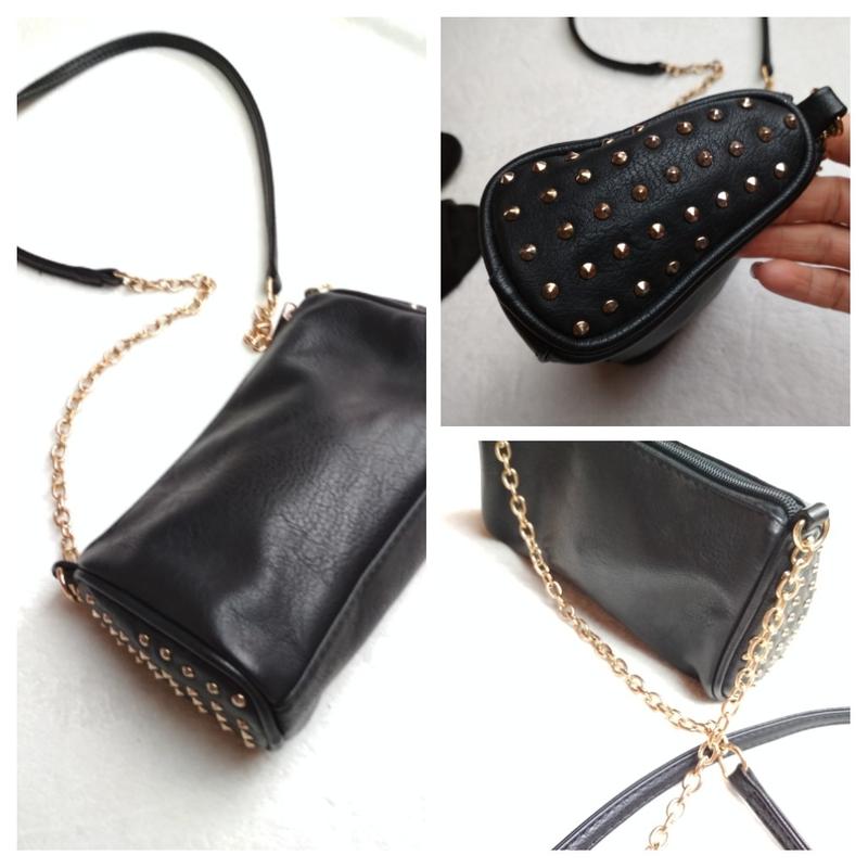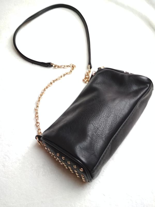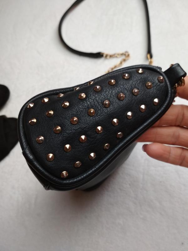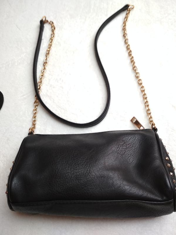 Стильная маленькая и вместительная сумочка , декорирована клёпками в золотом цвете, длинный ремешочек ,который частично из цепочки , частично кожзам. Сумка выполнена также из мягкого и качественного заменителя кожи, на одно большое отделение и одно маленькое на молнии внутри,подкладка из текстиля. Состояние идеальное, без каких либо дефектов. Размер сумки высота 12, длина 21, ширина по дну сумки 5 см, длина ручки 130 см.