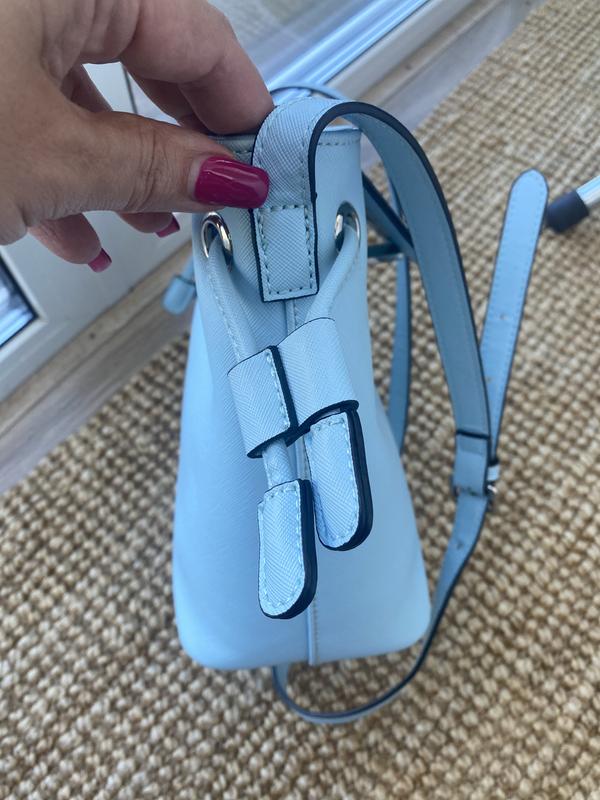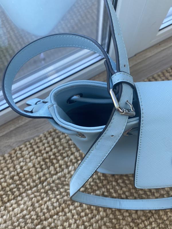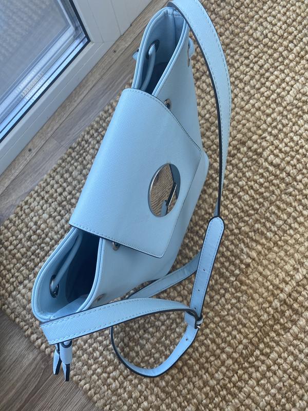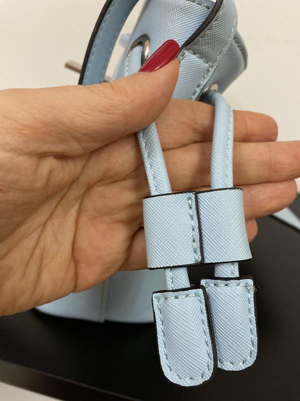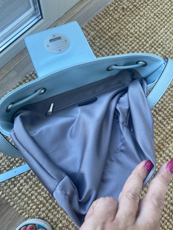 Сумка голубого цвета. Размер 21 см по низу, 29 см по верху, высота 24см. Плотная, устойчивая. Плечевой ремень не отcтегивается. Внутри по бокам два кармана.