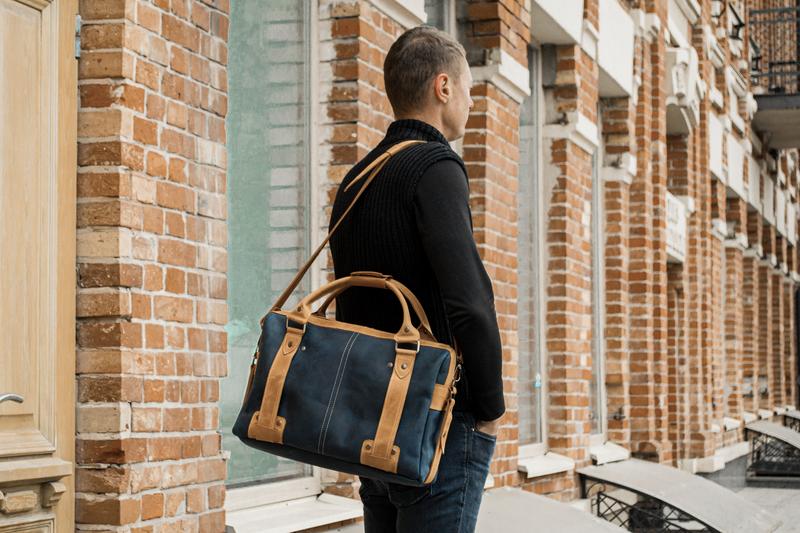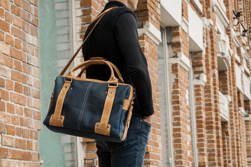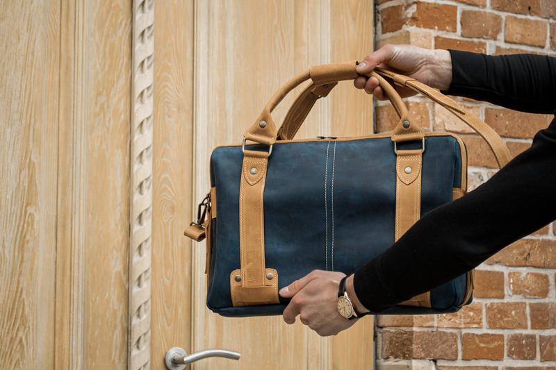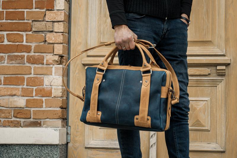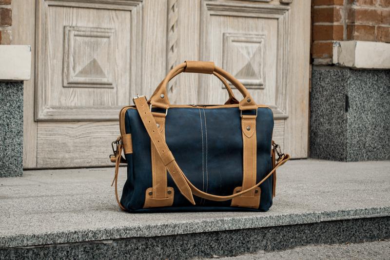 Мужская сумка "StyleMen" из натуральной кожи темно синего и табачного цвета воплощает в себе дизайн двух современных стилей: классического и скандинавского.