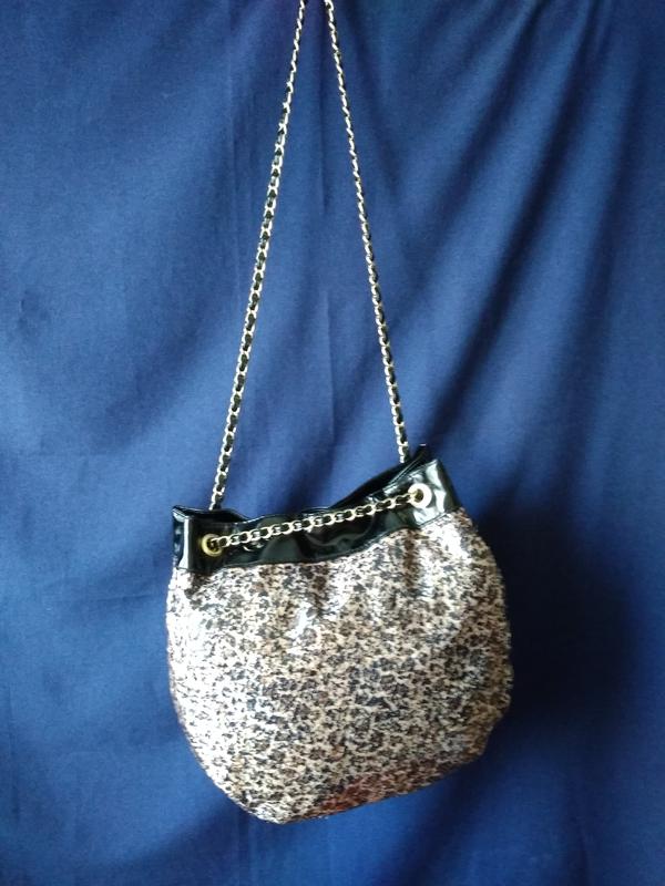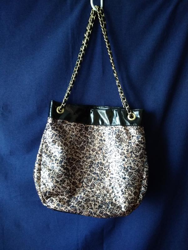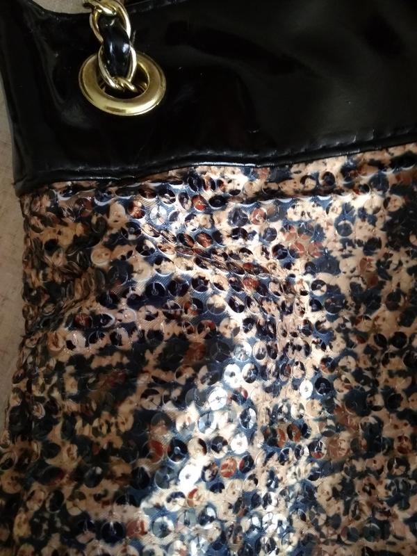 Легка ефектна літня сумка, на ланцюжку.Виготовлена з тканини з паєтками.Ручки можна регулювати. Застібка на кнопці.Розміри ширина зверху 30, низ 32довжина 32, дно 14/20