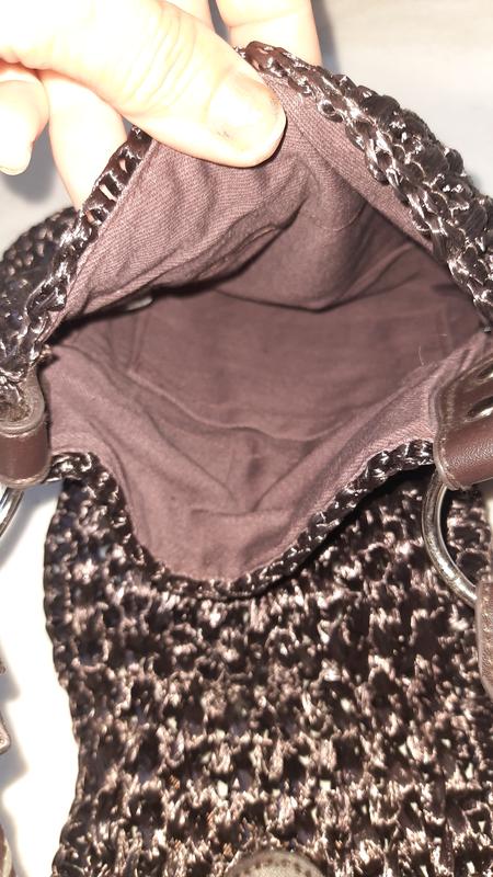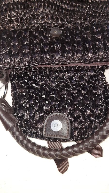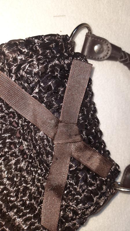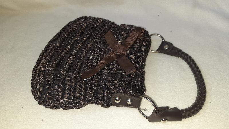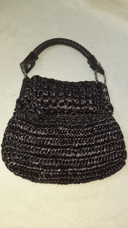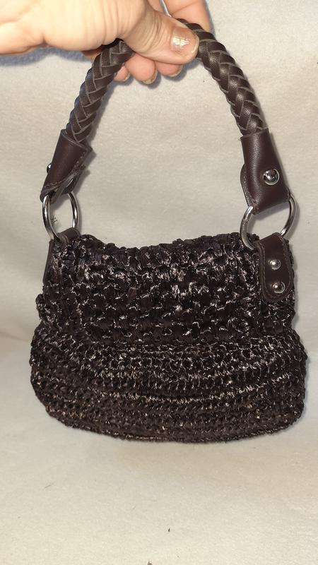 Маленькая вязаная сумочка, бумажная соломка,на подкладе,на магнитной застежке,в идеальном состоянии. Высота сумочки 20 см(глубина 18 см).Длина 23 смВысота ручки 12 см