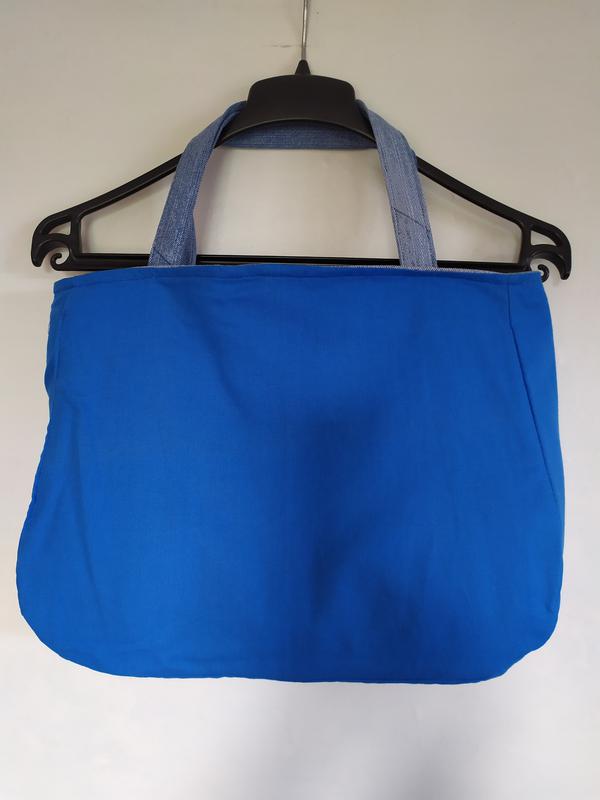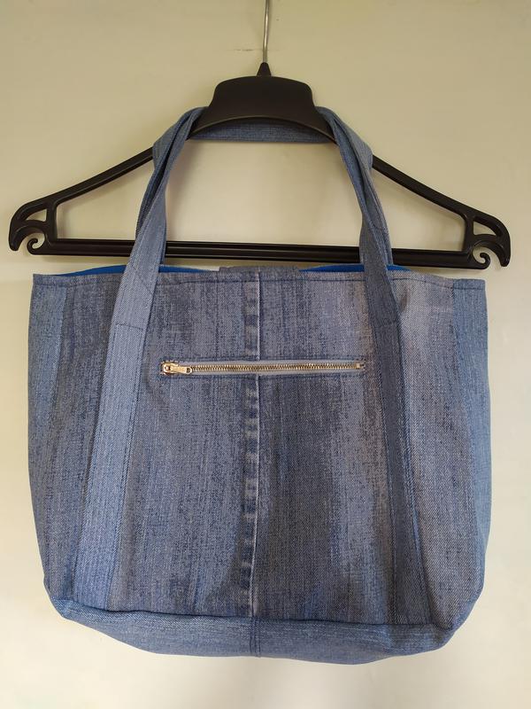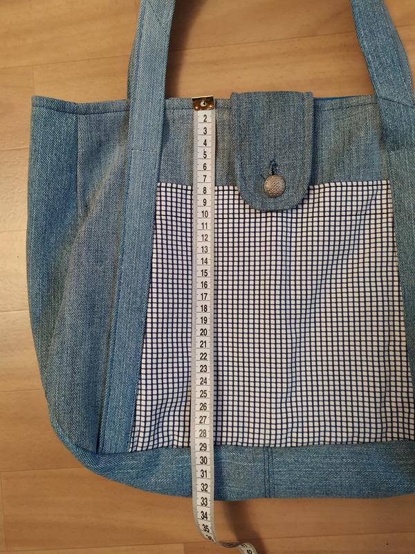 Джинсова сумка шопер на гудзику. Стиль исполнения: комби текстиль. Вместительная сумка на одно отделение. Внутри карман для мелочей или мобильного телефона. Внешний декор: карман на молнии, карман под фиксатор для пуговицы (ткань клетка). Стан: нова. Высота: 28,5 см. Ширина: 39 см Длина ручек: 44 см. Дно: 34×11см.
