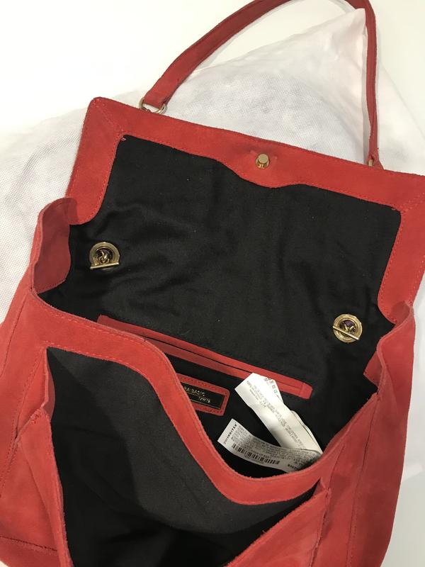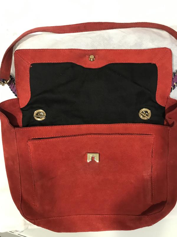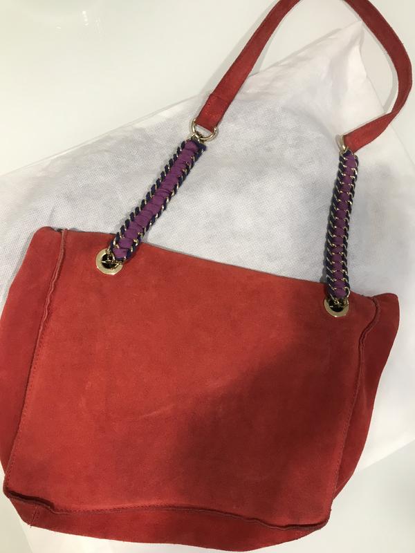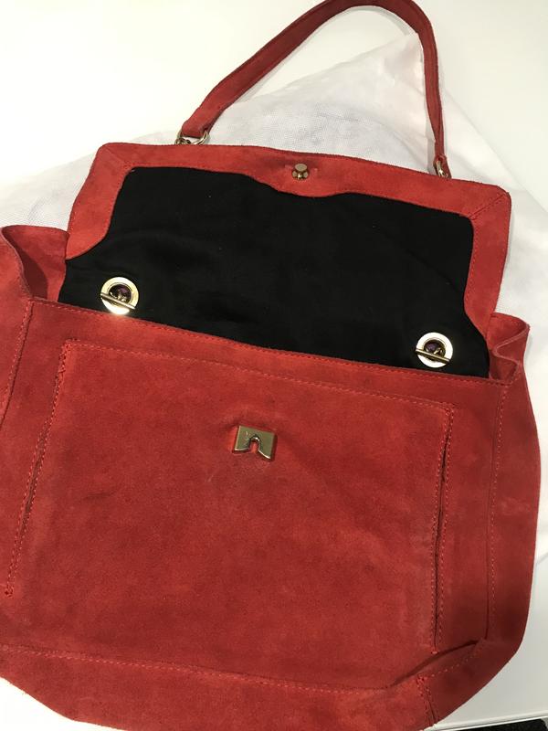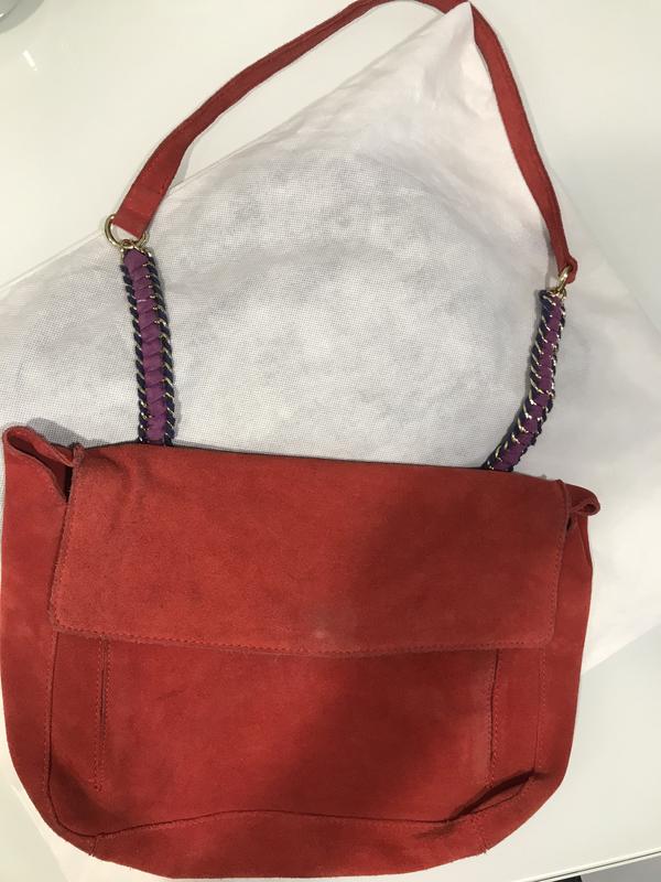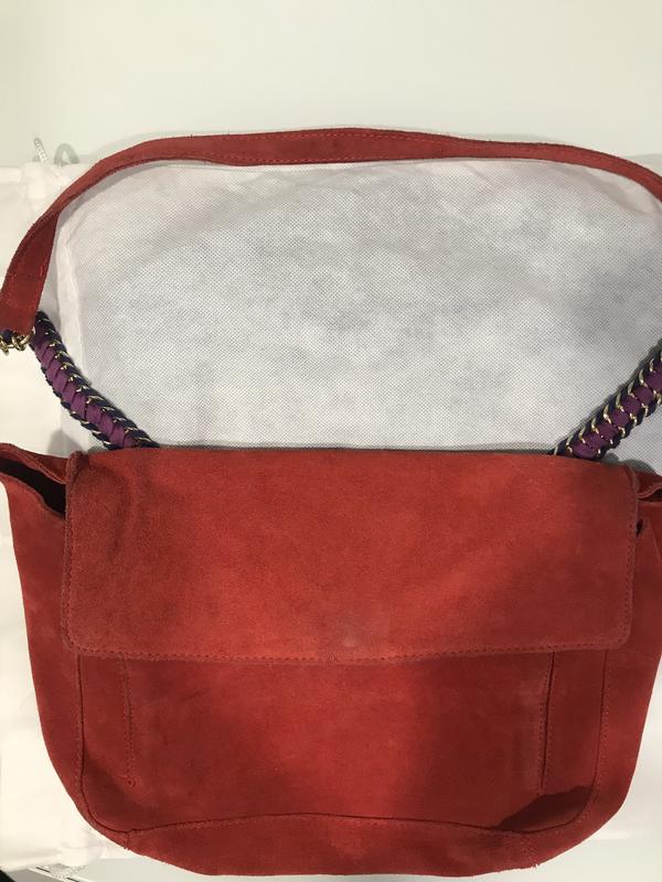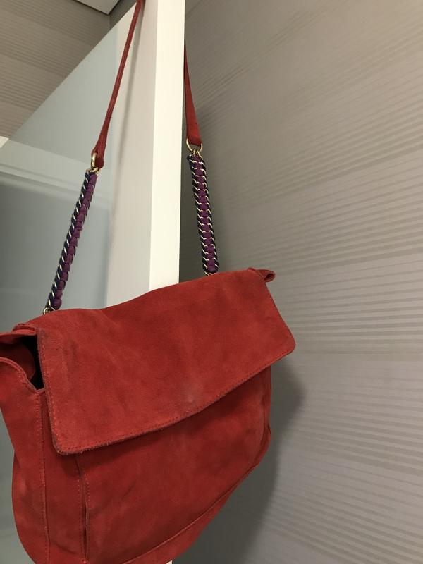 Натуральная замшевая красная сумка на длинной контрастной ручке на плече с двумя глубокими отделениями и тремя маленькими для мелочей/ в состоянии близком к новому/ мягкая