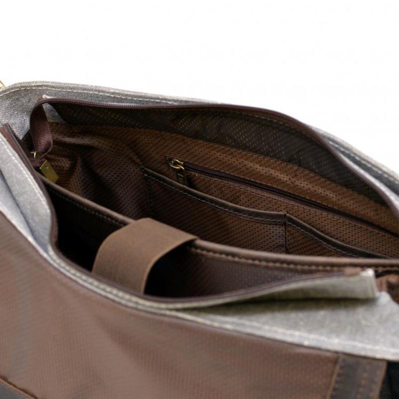 Изделие имеет одно основное отделение, внутри которого имеется уплотненный отсек для небольшого ноутбука, планшета или документов. Вмещает формат А4. Также, есть два открытых кармана для телефона и портмоне, и еще один на молнии. На задней стороне сумки есть крепление для ремня. На лицевой стороне аксессуара присутствуют два объемных кармана, прикрытых кожаным клапаном с ремешками на магнитах и логотипом бренда, что придает изделию особый стиль. Торцевые стороны изделия оснащены двумя карманами с клапанами, придающими сумке особый шарм. Удобно брать с собой в поездки - вместительная и легкая сумка.