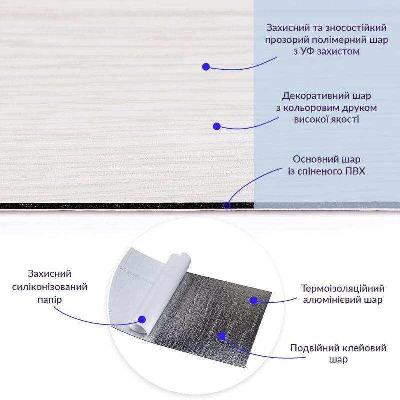 Полимерный слой (прозрачный), защищающий от потертостей и мелких механических повреждений, обеспечивает долговечность использования, а УФ защита помогает предотвратить выгорание, сохраняя цвет насыщенным, в результате чего виниловый ламинат долго имеет свой первоначальный эстетичный вид.