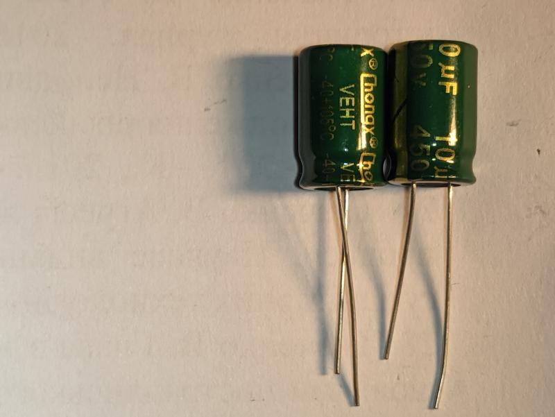Наличие переменно.Конденсаторы электролитические 10mkF*450V, -40-105°C, ChongX.Фактическая емкость – 8,7-9,8 mkFФактический ESRРазмер 10*17 мм.