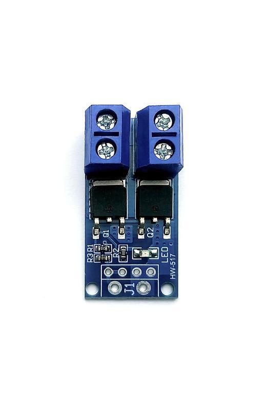 Модуль управления нагрузкой HW-517 Драйвер на двух MOSFET транзисторах D4184. Коммутация, управление нагрузкой (лампами, двигателем постоянного тока, электромагнитным клапаном и т. д.). ШИМ - контроль скорости двигателя, яркость лампы и т. д. Источник сигнала - микроконтроллер IO порт, PLC интерфейсы, PWM сигнал, источник постоянного тока и т. д. Характеристики: • Управляющий ШИМ сигнал 3,3 - 20 В, частота 0 - 20 кГц • Выходное напряжение: 0-36 В • Выходной ток нагрузки: 15А (до 30А при охлаждении) • Мощность: 400 Вт • Размеры: 34 х 17 х 17 мм