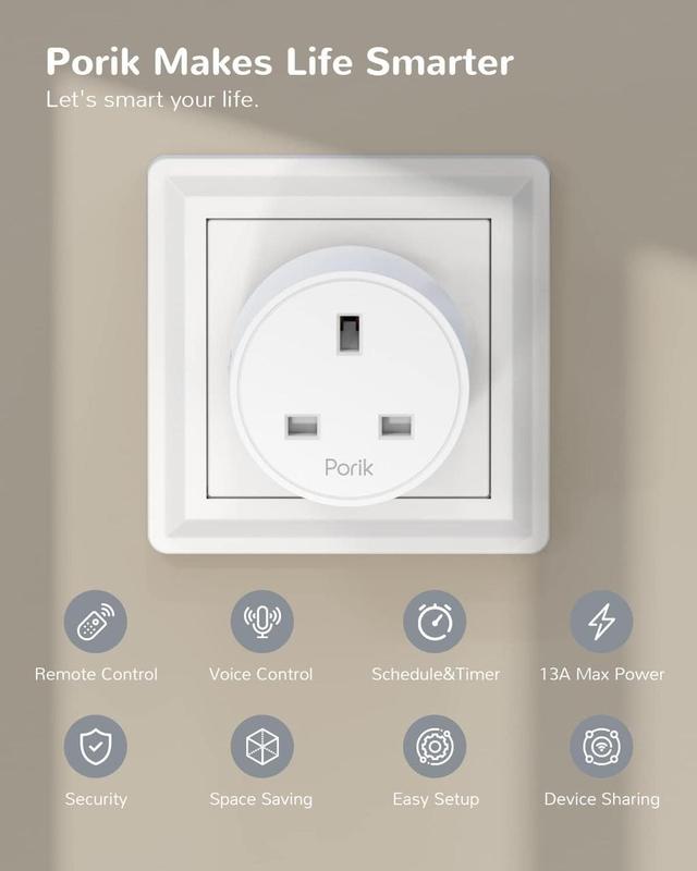 - ⚡【Безопасность】 --- Умная розетка Porik одобрена для обеспечения безопасности и поддерживает до 13 А и 2990 Вт. Умные розетки автоматически отключаются при перегрузке или перегреве, чтобы защитить вас и вашу семью.