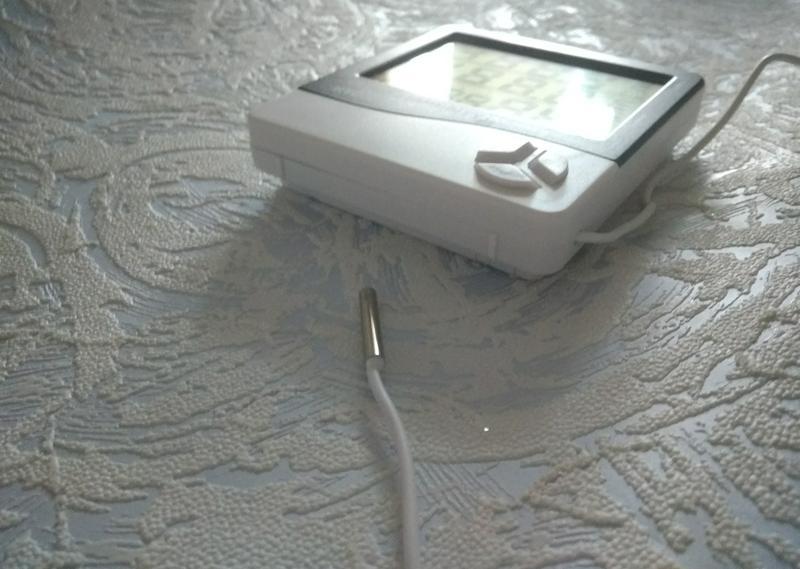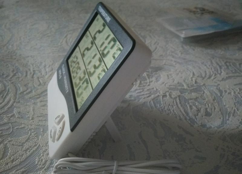 Прилад зображає одночасно вологість, час, температуру всередині приміщення й зовнішню температуру на виносному датчику.