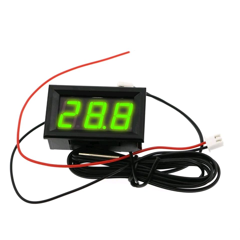 Вид приладу: Термометри Цифровий світлодіодний термометр, світіння зелене: Опис: - Тип: врізний термометр - Матеріал: пластик - Розмір: 48x29x23 мм - Частота оновлення: 200 мс/сек - Струм: 20мА - Довжина проводів живлення 20 см - Довжина проводу з датчиком 1 м - гільза 3 мм на кінці датчика. -колір підсвітки зелений 1. Діапазон вимірювання: від -50 до +110 °c, точність вимірів: 0,1°c, 2. Напруга живлення: постійна від 5 до 12 Вольт, 3. Використання: автомобіль, температура тіла, басейн, акваріум, тераріум, резервуари для води, холодильник, промислове обладнання і всі види вимірів температури. Застереження: живлення немає перевищувати 13 Вольт, полярність живлення не повинна порушуватися.