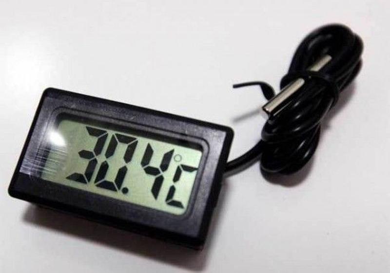 Цифровий термометр. Характеристики: Діапазон вимірюваних температур: від -50 до 99 градусів Діапазон експлуатації корпусу з дисплеєм від -5 до 50 градусів Довжина проводу виносного датчика 1 м Живлення від двох батарейок типу LR44 (йдуть в комплекті) Габаритний розмір: 48 * 29 * 16 мм Розмір під установку: 45 * 26 мм Колір корпусу: чорний