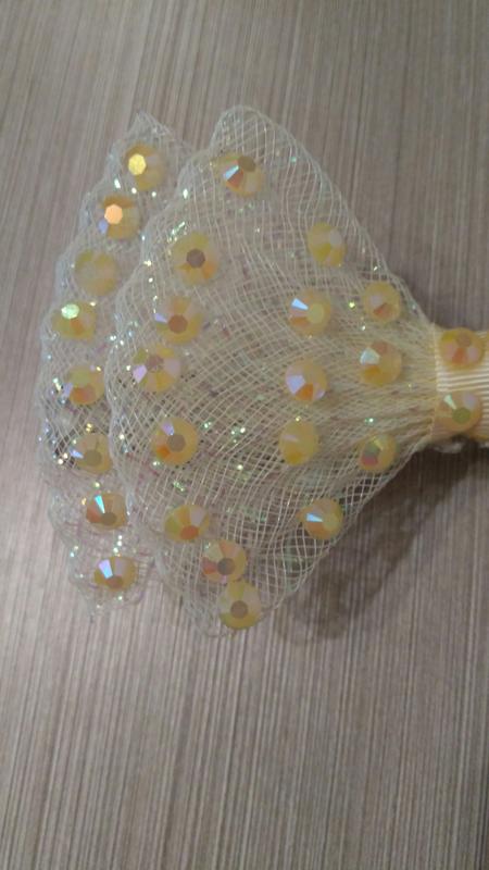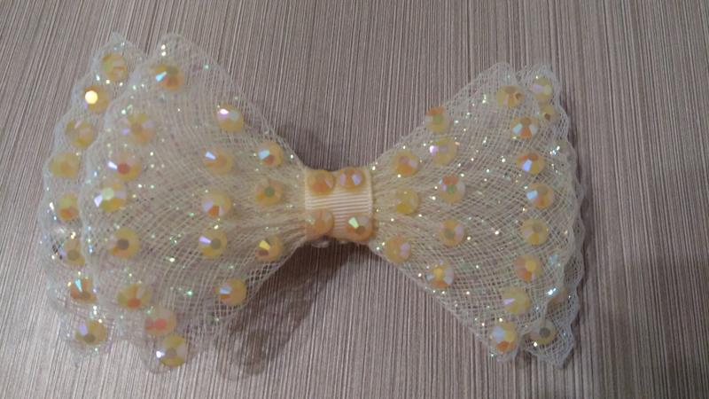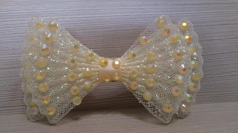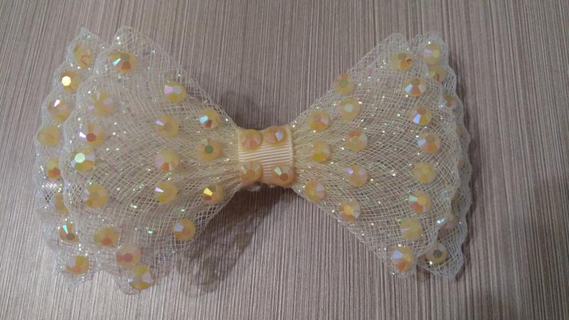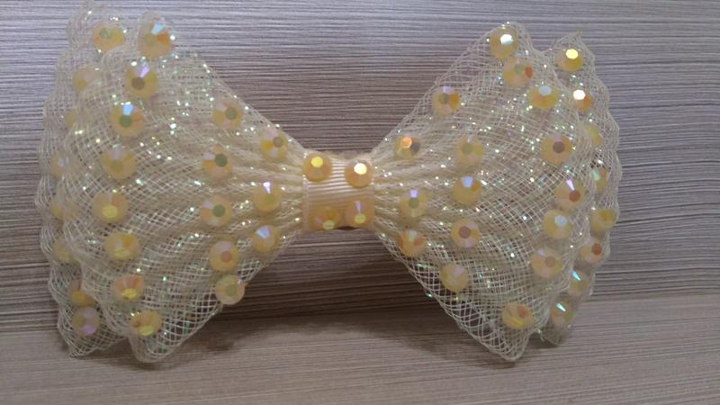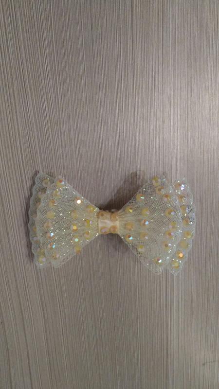 Заколка в виде бантика с камнями.Камни красиво блестят на солнце.Цвет светло бежево-золотой.Есть в двух расцветках она.