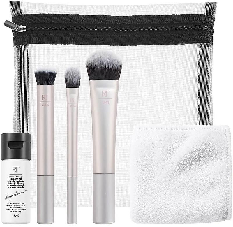 В наборе 3 щеточки: для румян, консилера и для тональной основыПолотенце / салфетка для снятия макияжа Очиститель для салфетки и щеточекКосметичка
