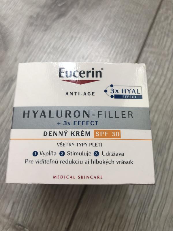 С возрастом в коже уменьшается выработка гиалуроновой кислоты, что приводит, в частности, к углублению морщин. Дневной крем Eucerin Hyaluron-Filler + 3x Effect с SPF 30 замедляет процесс старения кожи и уменьшает углубление морщин. Кроме того, крем питает и разглаживает кожу, а также защищает ее от свободных радикалов.