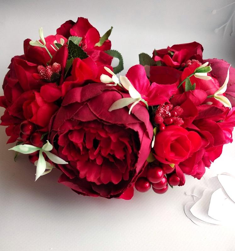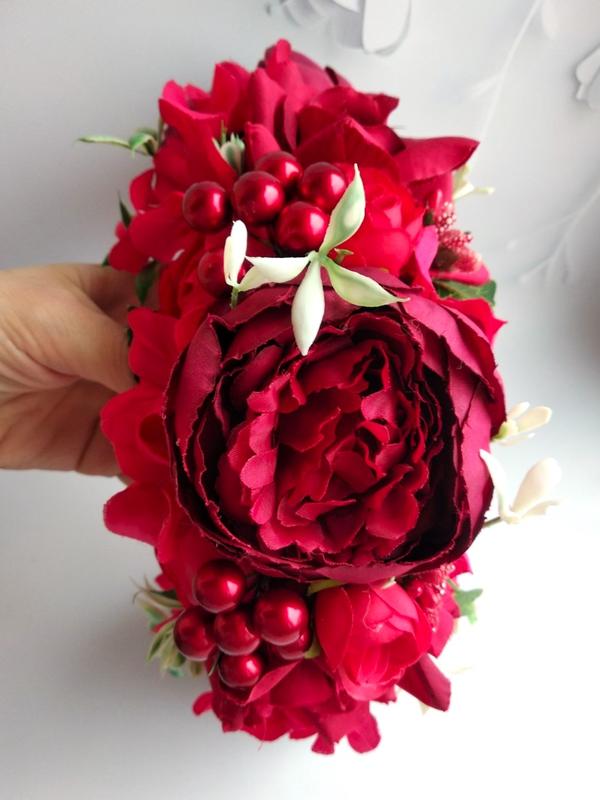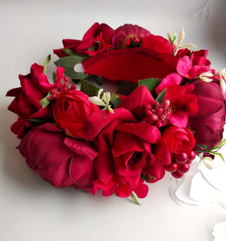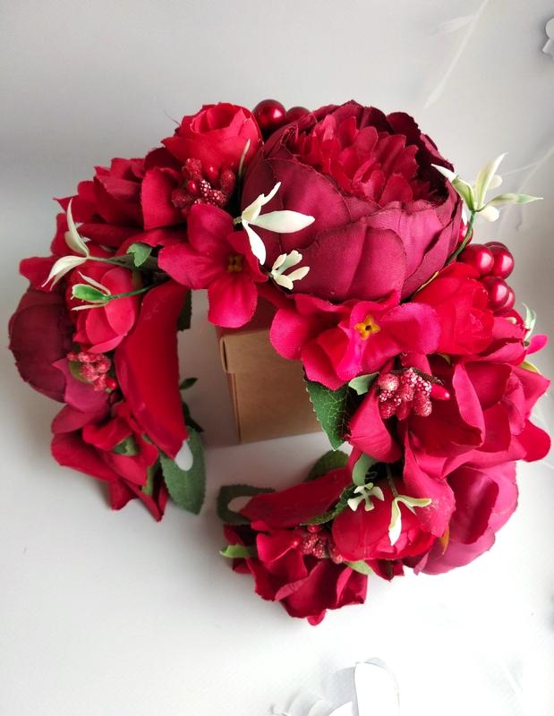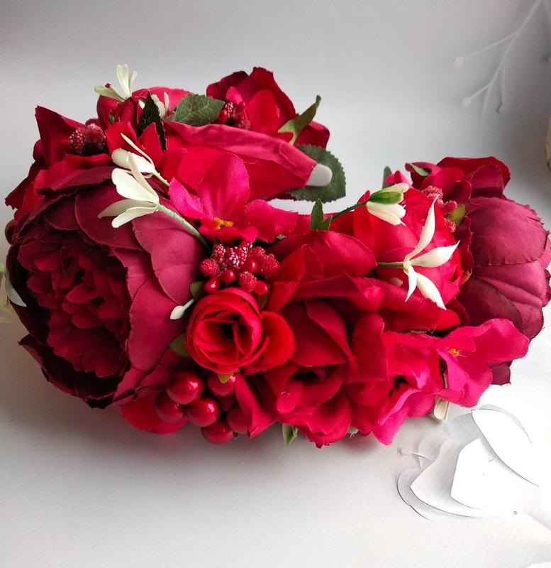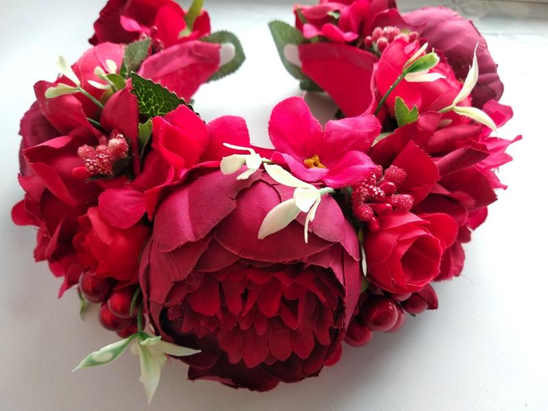 Веночек объёмный, но в то же время легкий, выполненный на тонком металлическом обруче, по этому он удобный. Цветы легкие, не утяжеляют.