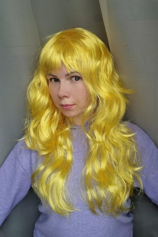 Длинный желтий парик карнавальный с челкой волнистый волос желтого цвета для образа антме