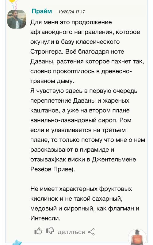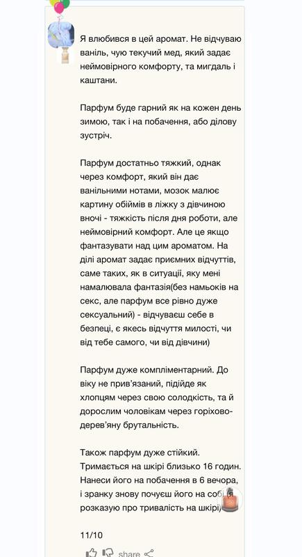 Смолистый элеми, пряные ноты даваны, поджаренные каштаны и искрящийся ромовый аккорд. Универсальный сладкий аромат для мужской аудитории. Добавляет статус. Стойкость до 7 часов. Лучше на позднюю осень и зиму.
