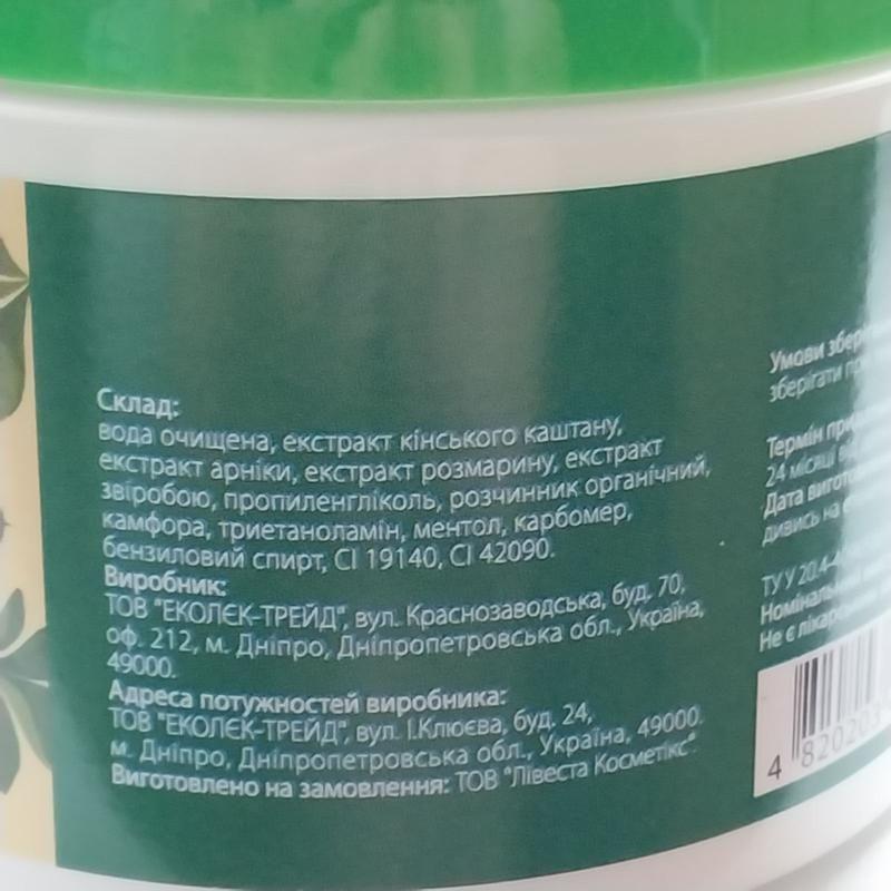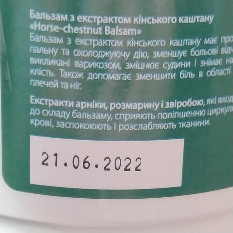 Страна производства Украина! Поддержи своего украинского производителя!!! Бальзам с экстрактом конского каштана свежего выпуска и хороший срок хранения , обладает противовоспалительным и охлаждающим действием, уменьшает болевые ощущения, вызванные варикозом, укрепляет сосуды и снимает отечность. Также помогает уменьшить боль в области шеи, плеч и ног. Экстракты арники, розмарина и зверобоя, которые входят в состав бальзама, способствуют улучшению циркуляции крови, успокаивают и расслабляют ткани. Спосіб застосування: Нанести масажними рухами на уражену ділянку тіла: зони варикозного розширення вен і «набряклі» ноги, область спини і шиї (при больовому синдромі). Також можна використовувати для розслабляючого масажу та для зняття втоми тіла. Тільки для зовнішнього застосування. Уникати потрапляння в очі та порожнину рота. При потраплянні в очі або порожнину рота промити великою кількістю води. Вага 500 мл