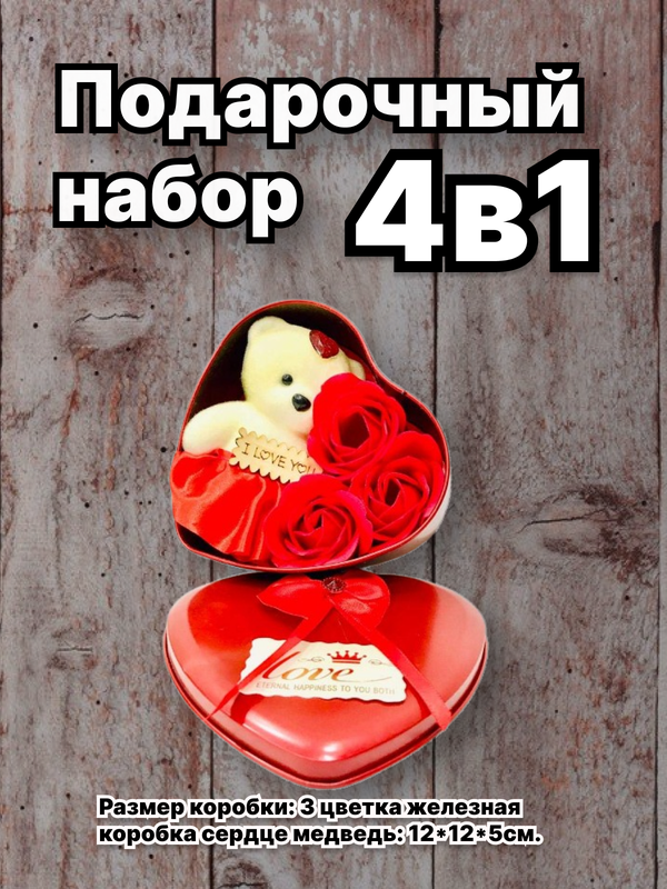 Коробка в форме сердца с мыльным цветком с 3 розами 1 мишка Мыло – это то, чем мы пользуемся каждый день, не задумываясь о том, что помимо косметических и гигиенических у мыла есть еще и эстетические свойства. Между тем ценители мыльного искусства уже нашли как применить это в интерьере и в быту. Красивые мыльные бутоны, полезные в быту, заботливо сложены в коробку сердечко и дополнены милой игрушкой. Цветы из мыла изготовлены из высококачественной мыльной основы с применением безопасных ненавязчивых отдушек. Одно из главных свойств таких необычных букетов то, что они не вянут со временем! Мыльные цветы хранятся около 3-х лет, соблюдая правила ухода: не ставить под лампу и люстру не поливать можно обработать эфирными маслами для придания аромата В подарочный набор входит: 3 ароматных розы, лепестки которых растворятся в вашей ванне. Мишка Оригинальная упаковка в форме сердца, расскажет о нежности Ваших чувств Шкатулка в форме сердца Характеристики: железная коробка в форме сердец цветок мыла. Размер коробки: 3 цветка железная коробка сердце медведь: 12*12*5см.
