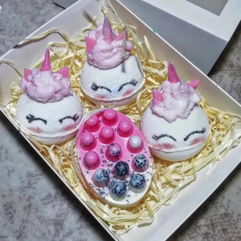 Отличный подарочный набор по уходу за телом для маленьких принцесс, и не только. В наборе бомбочки для, изготовленные на основе морской соли с различными ароматами, украшены пенкой на основе кокосового масла и мыльными фигурками (рог и ушки), массажное мыло-скраб, которое смягчает, увлажняет, отлично очищает и ухаживает за кожей. Мыло может быть с люфой, или без. Цена набора - 290грн (без люфы). Цена набора - 310грн (с люфой) Детали в приват.