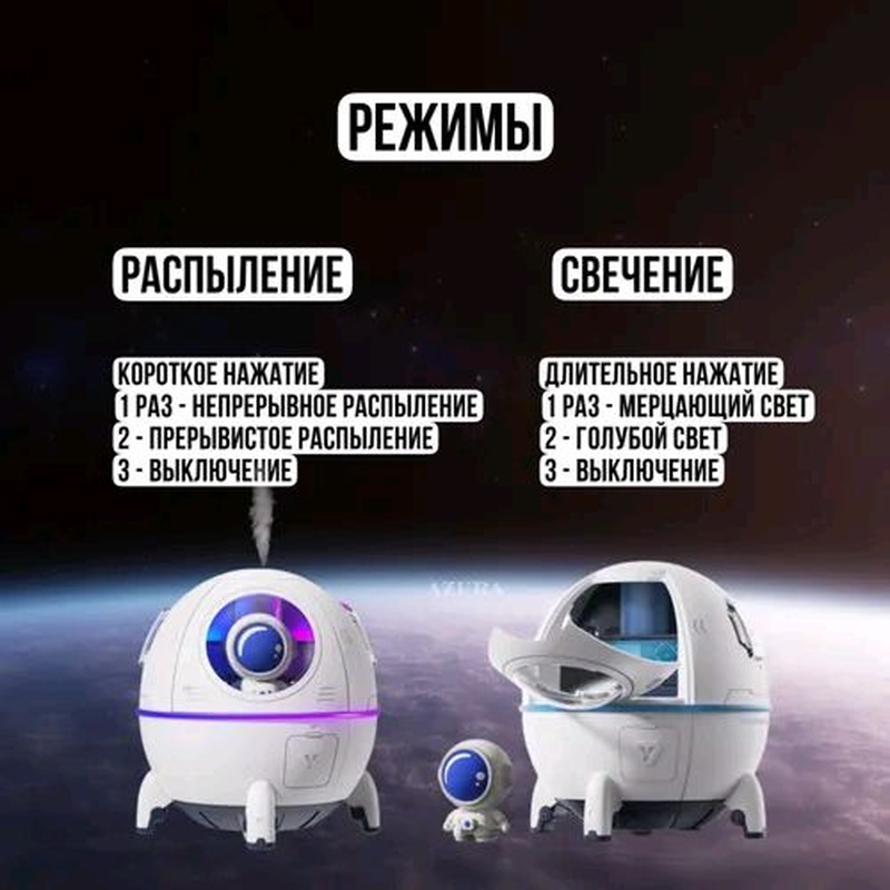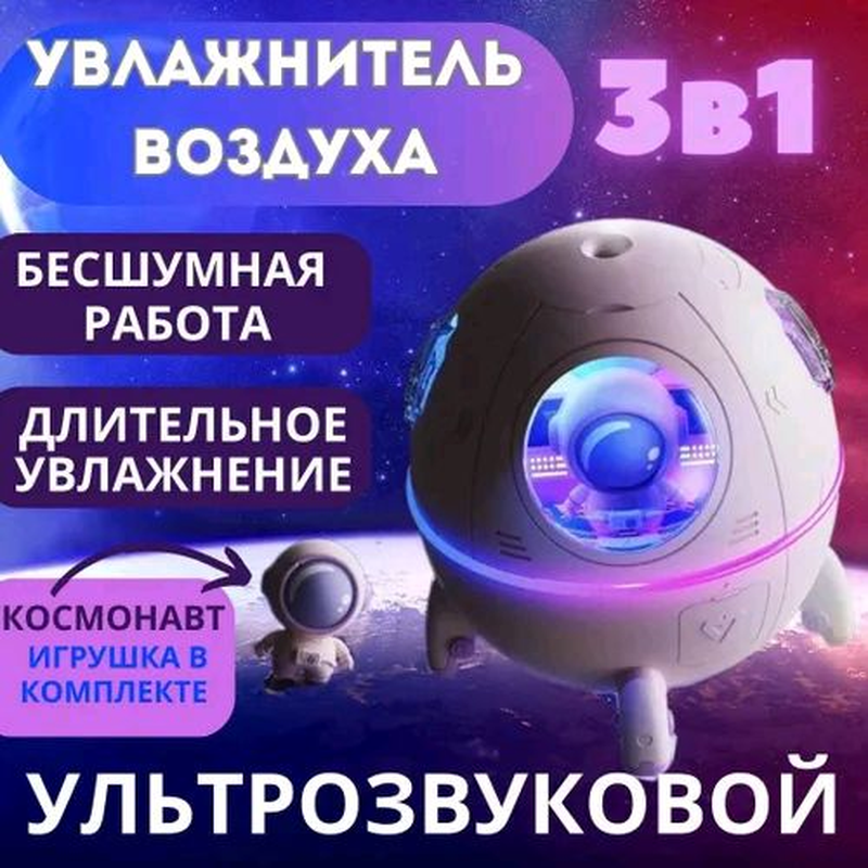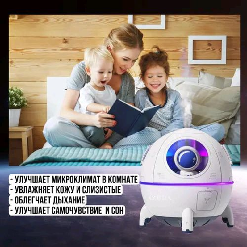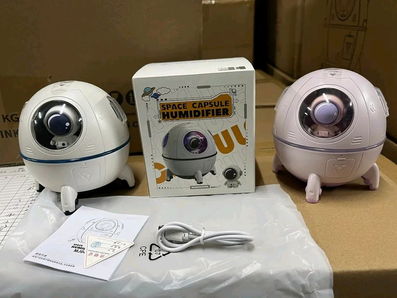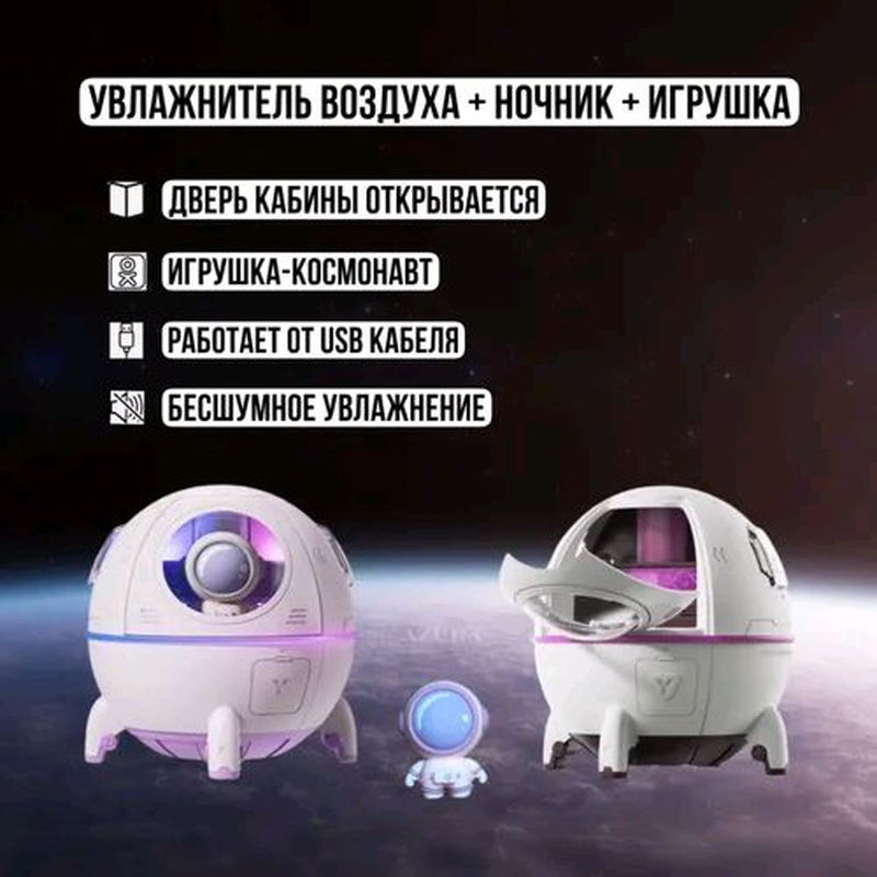 Портативний зволожувач повітря/аромадифузор. Об'єм резервуара зволожувача/аромадифузора становить 220 мл, швидкість розпилення 40 мл/год, є функція регулювання інтенсивності розпилення. З його допомогою можна підтримувати комфортний рівень вологості в невеликому приміщенні, що чудово позначається на диханні та зволоженості слизових нашого організму.Це стильний ґаджет чудово підійде для дитячої кімнати — він виготовлений як космічний капсули з лялькою космонавта, яку можна витягнути та використовувати для ігор. Також аромадифузор можна використовувати як нічник — оскільки він безшумний і має м'яку підсвітку, що змінюється. Дитина (зокрема ваша внутрішня дитина) буде в захваті! Водночас отримає користь для здоров'я — що важливо.Зволожувач має компактні розміри, що дає змогу легко переносити його в потрібне місце. Роз'єм для зарядного кабелю у форматі Type-C, зволожувач можна під'єднати до будь-якого пристрою з входом USB.Зволожувач безпечний у використанні — є ущільнювальне гумове кільце, яке дає змогу утримувати воду за нахилу ґаджета. Для наливання води потрібно просто зняти кришку, можна додати улюблені водорозчинні ефірні олії та ваша кімната наповниться приємними ароматами.