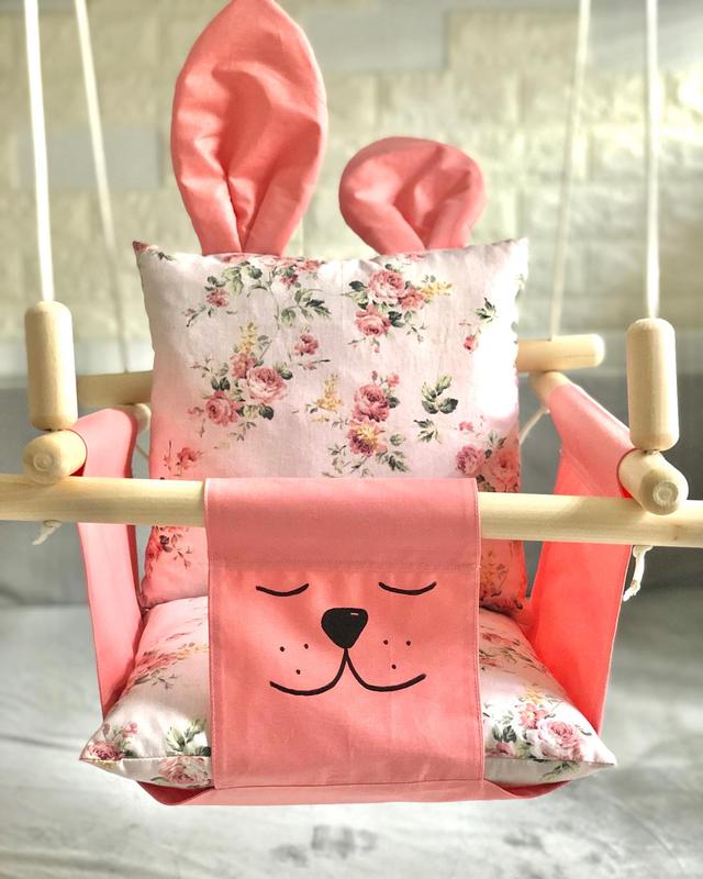 Качелька виготовленна із 100% бавовниВитримує до 30 кгВ комплекті:Качеля2 Подушки4 палиці (бук)2 карабінаШнур (паракорд)