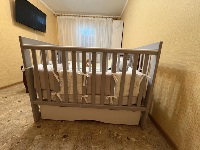 Дитяче ліжечко у гарному стані. Є дефекти (на фото). Проте незначні. Їх не побачити одразу. Є маятник. Працює. Є шухляда. Колір сірий. В комплекті йде матрац та комплект білизни з косичкою /подушками (все як на фото)