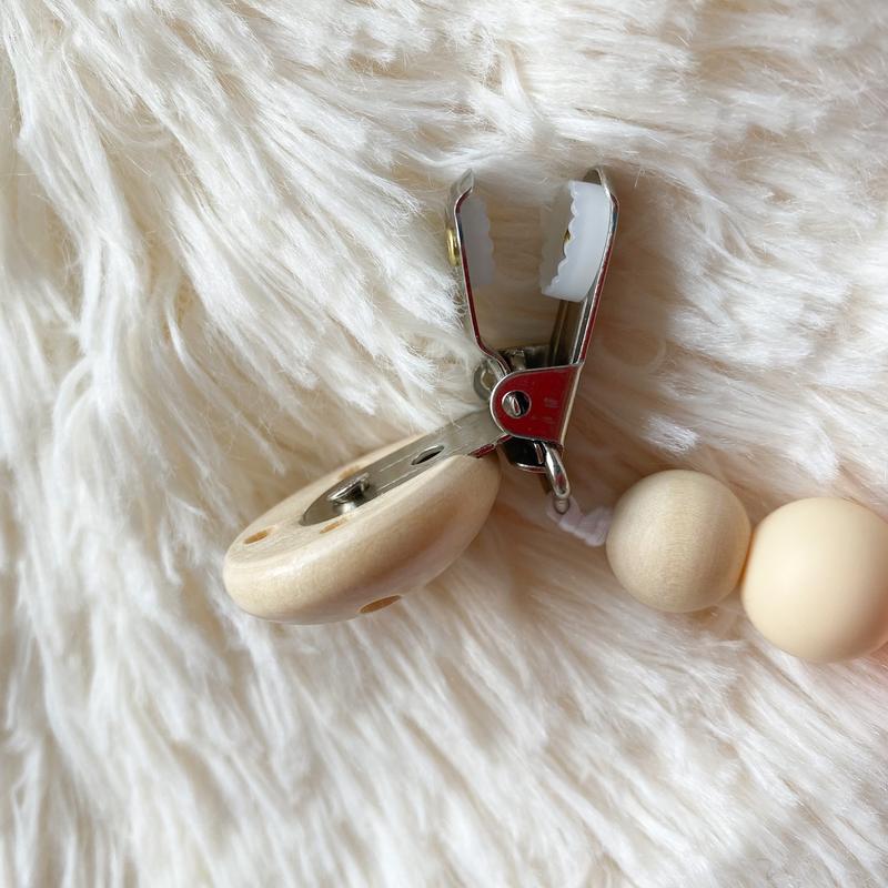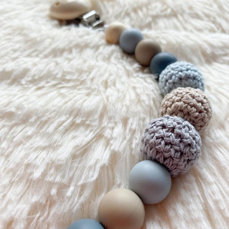 Длина крепления и бусин 23 см, длина полностью 35 см. Качественный и безопасный металлический держатель, состоит из деревянных, вязаных и силиконовых бусин, которые можно грызть.