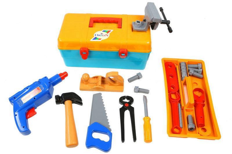 Набор инструментов Маленький столяр в чемодане Orion Этот комплект Маленький столяр имеет очень удобный переносной чемодан, размеры которог********** мм. В комплект входят следующие инструменты: непосредственно чемодан, пила, молоток, дрель, ключ, сверло, тиски, рубанок, линейка, 2 уголка, 6 болтов, 6 гаек, 6 планок с отверстиями, а также щипцы. Этот набор предназначен для мальчиков старше 3 лет. Игрушечный набор Маленький столяр отличается от предыдущей модели Маленьким механиком из арт. 921 только тем, что ножовка для металла заменяется на пилу, плоскогубцы на клеще, добавляется еще рубанок, а вместо трех крупных планок, трех планок малых, трех уголков есть только по два экземпляра. Особенности Возраст: от 3 лет Материал: пластик Страна-производитель: Украина Размеры набора: 320x180x145 мм Вес - 0,793 кг. Упаковки -- кейс