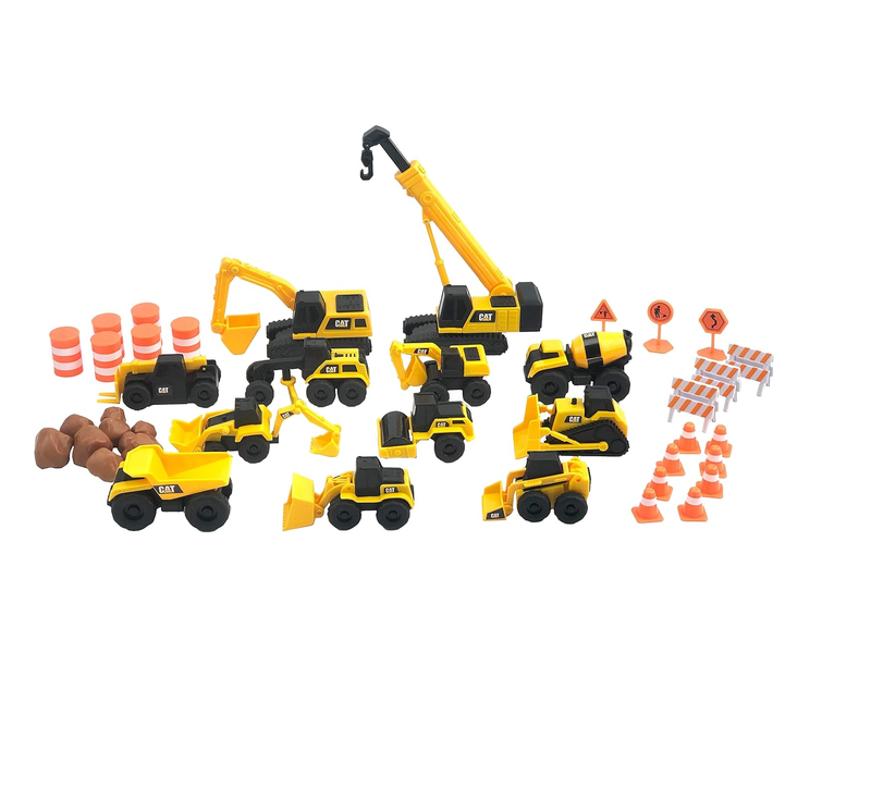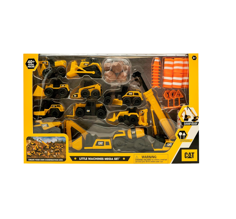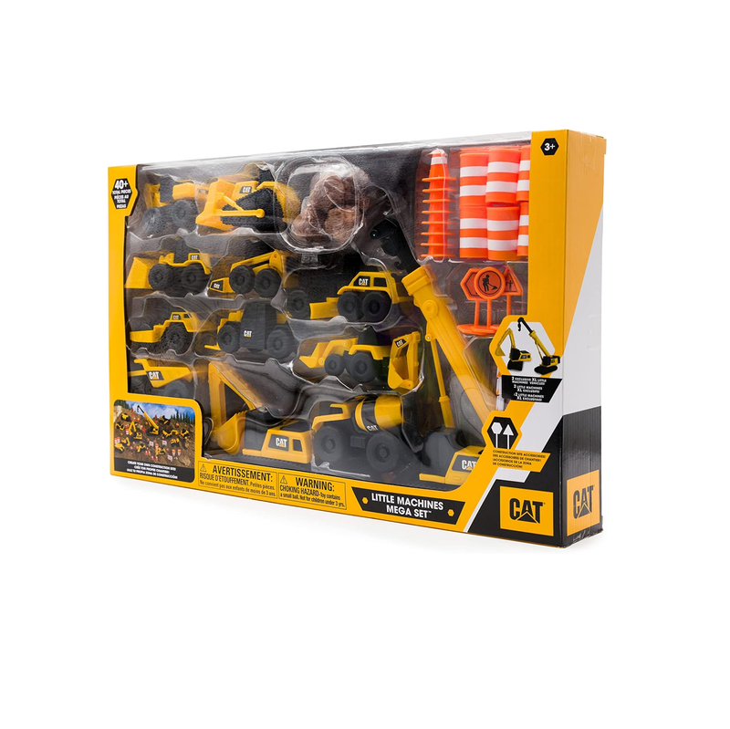 В общей сложности более 40 единиц включает в себя ассортимент транспортных средств Little MachinesTM, эксклюзивный кран и экскаватор XL Little Machines, которые идеально подходят для транспортировки и копирования, а также различные аксессуары для строительных площадок, такие как дорожные знаки, конусы, бочки и валуны.