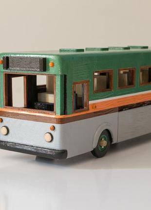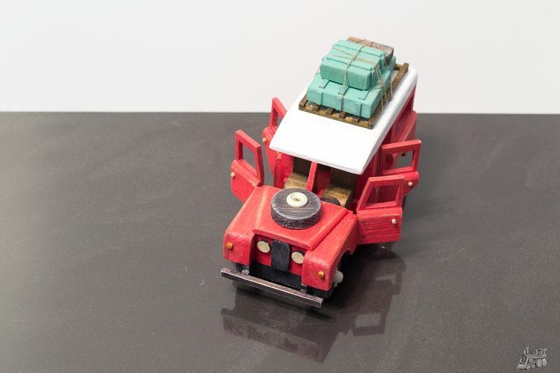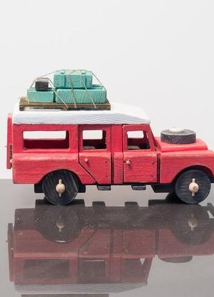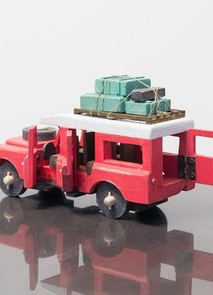 Эта машинка хорошо подойдёт как для игры, так и в качестве интерьерной игрушки, например для украшение комнаты. Материал изготовления сосна, присутствуют элементы из других пород дерева и фанеры. Машинка покрашена акриловой краской и вскрыта акриловым лаком.