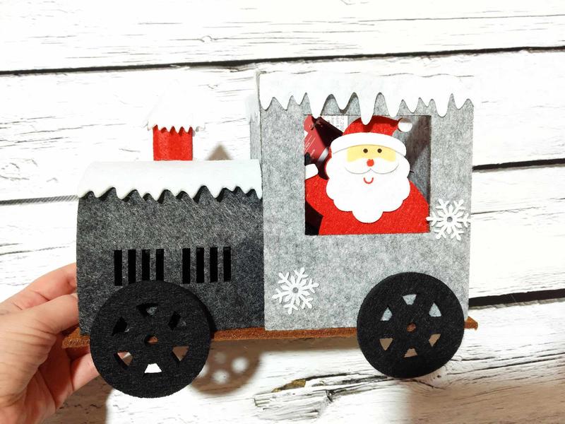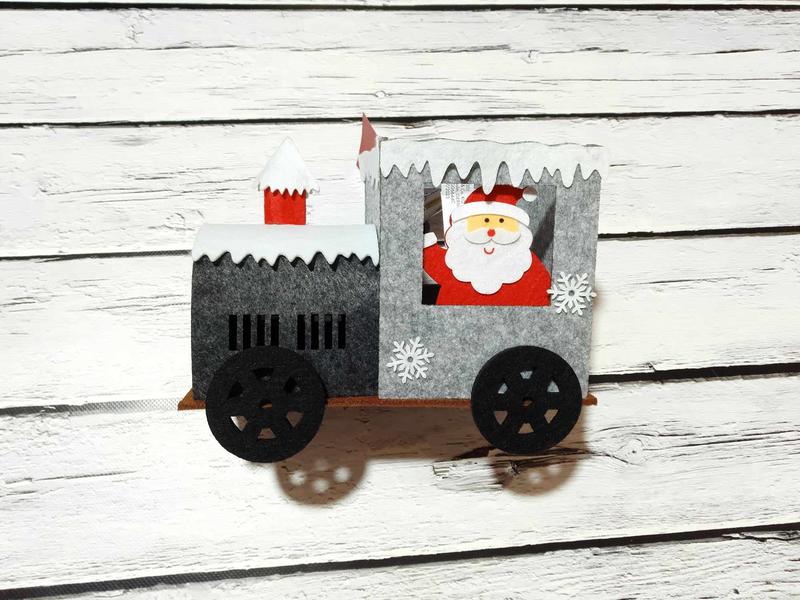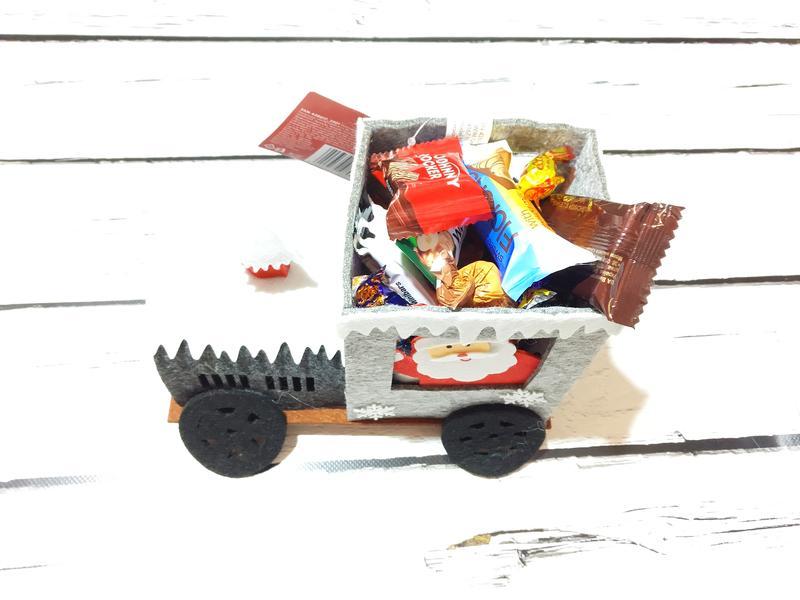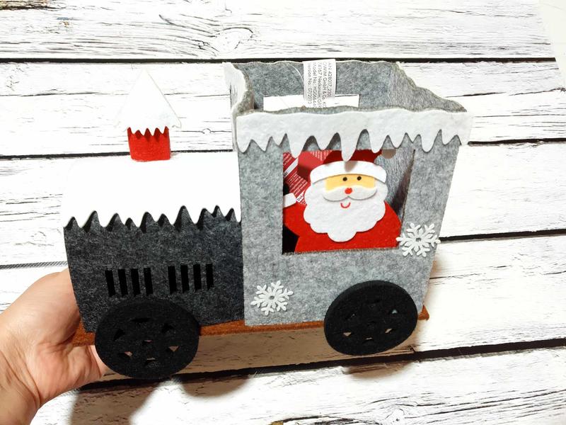 В наличии очень красивый новогодний тракторец из фетра. Большой, вместительный.Можно заполнить сладостями или какими-то безделушками. Поместилось 450 грамм конфет, фото 5.В реальности очень красивый.