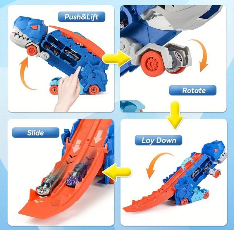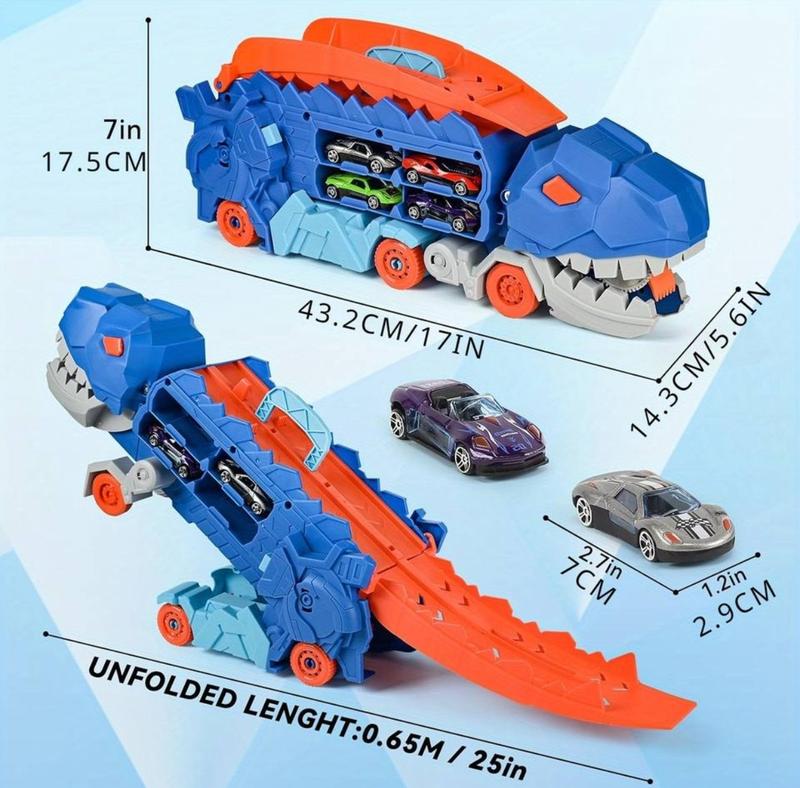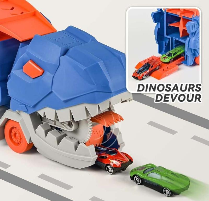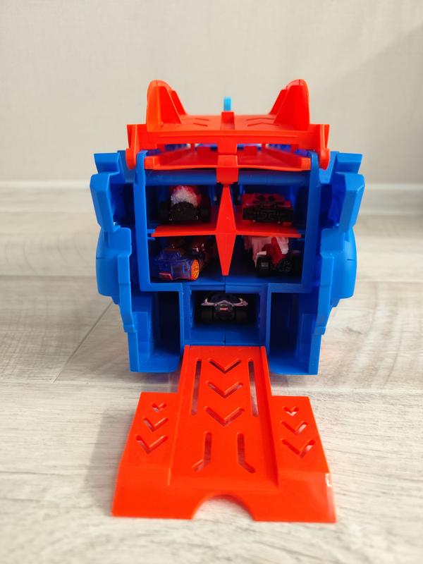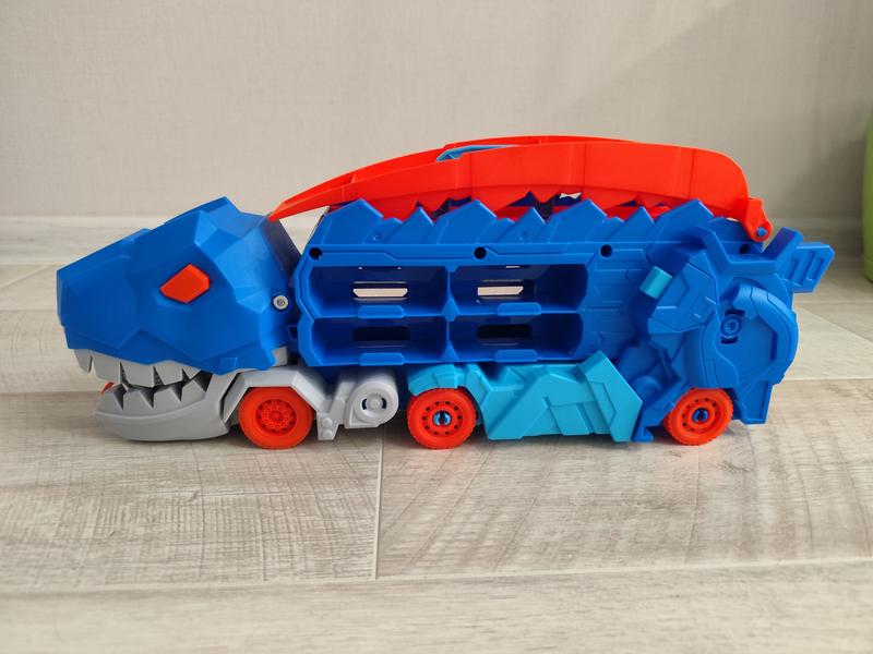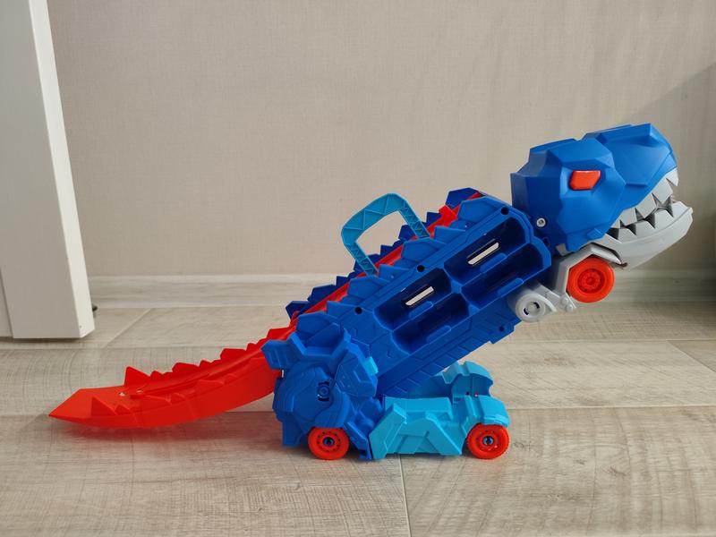 Мега-транспортер невероятный Ти-Рекс похож на hot wheels имеет сразу два режима игры. В первом, как транспортер, он может поглощать и перевозить три машинки, после чего во втором режиме он превращается в тираннозавра с треком на спине. Во время езды хищник “есть машинки” и они выезжают сзади – в пасть зверя размещены специальные лопасти, которые при движении подхватывают мини-машинки и отправляют их во внутренний отсек трейлера
