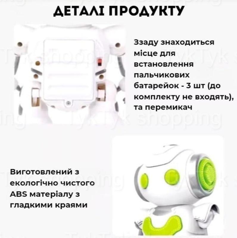 - Для робота требуются 3 батарейки АА, для пульта дистанционного управления -- 2 батарейки АА (НЕ ВХОДЯТ В КОМПЛЕКТ).