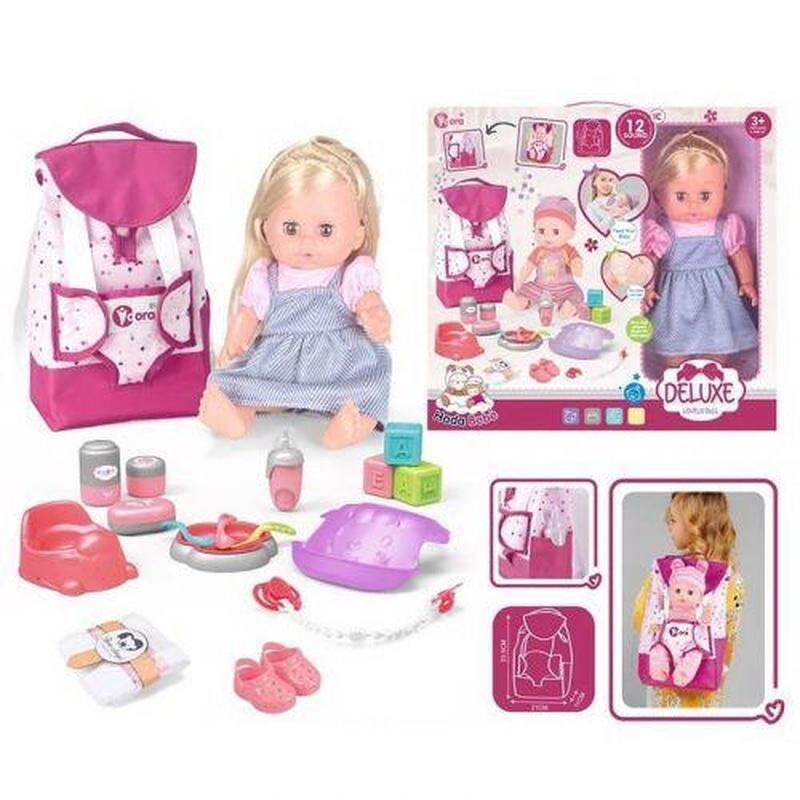 Пупс висота 30 см, чип зі звуками, п’є, ходить в туалет, заплющує очі, аксесуари, рюкзак, в коробці