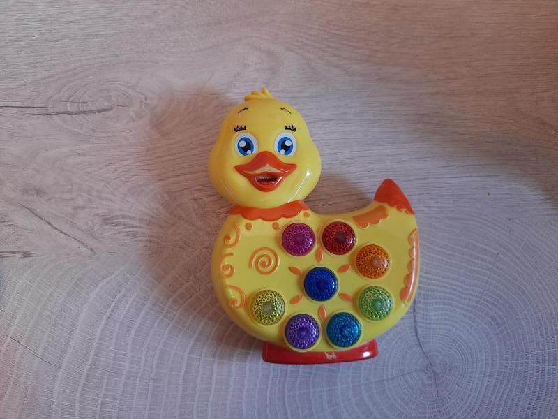 Имеет потертости, на фото видно.16 стишков. Каждая кнопка имеет 2-3 разных звука. Светится.Размер игрушки: 14.5х10.5х2.5 см.Подходит для 6м+