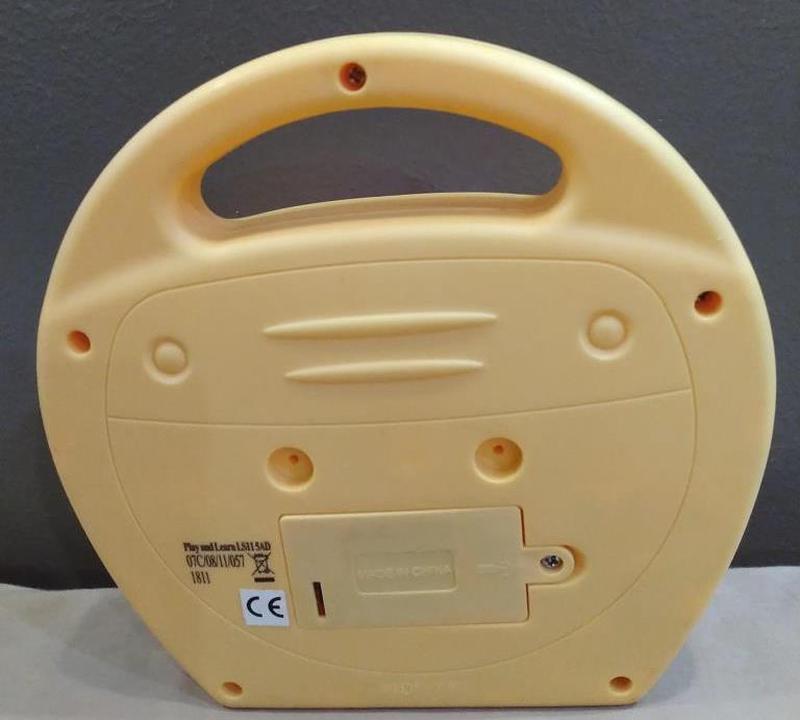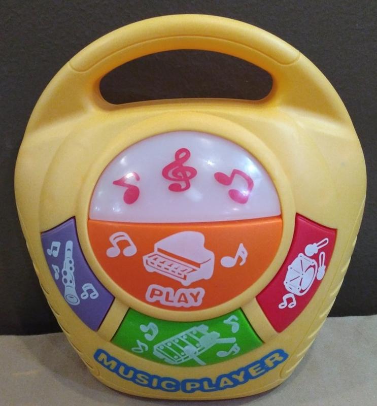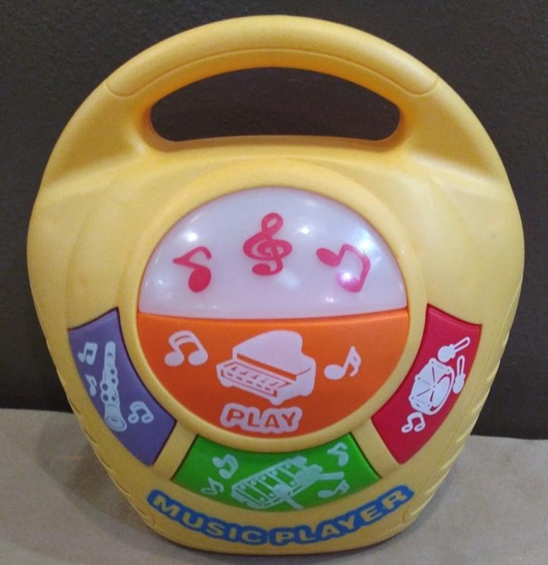 Музыкальный плеер Little Tikes. Работает от батареек. Танцевальные мелодии в исполнении изображенных на картинках инструментов: пианино, барабан, ксилофон, трамбон. Во время музыки верхняя панель светится мигающими красными огоньками.